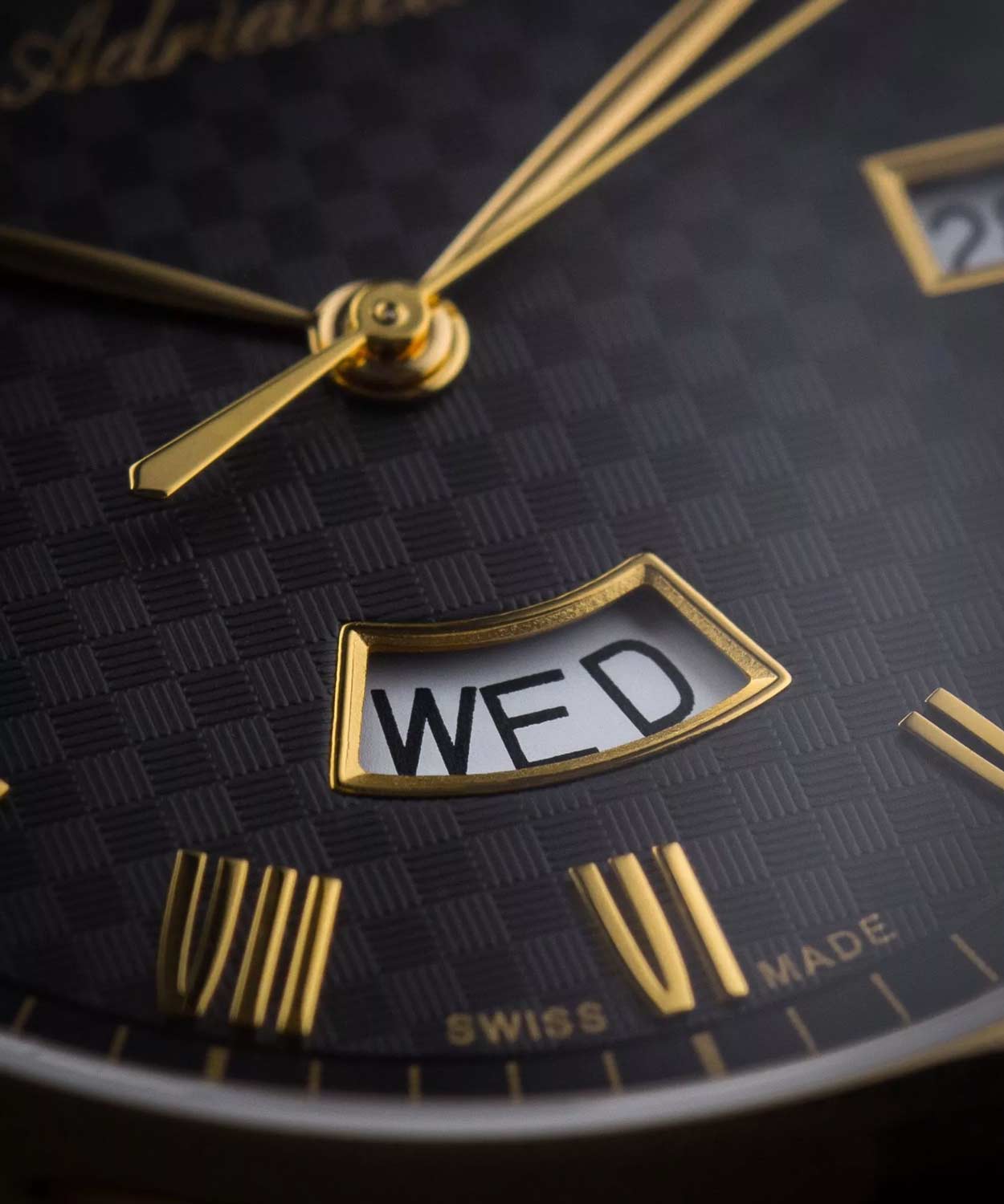 Часы Adriatica A1025.2166Q представляют собой идеальное сочетание элегантности и функциональности, разработанное для современных мужчин. Их стильный циферблат защищен сапфировым стекломСапфировое стеклоПрочный и надёжный материал из кристалла сапфира синтетического происхождения, характеризующийся особой твёрдостью и устойчивостью к царапинам и повреждениям., что придает дополнительную устойчивость к царапинам. Корпус из нержавеющей стали подчеркивает их изысканность и долговечность. Надежный кварцевый механизм с калибром RONDA 517 гарантирует точность времени, а водозащита WR 50 (5 ATM) обеспечивает защиту от воды в различных условиях. Браслет из нержавеющей стали  с раскладной застёжкойРаскладная застёжкаТакой тип застёжки используется только на браслетах из металла. Она никогда не раскрывается полностью, происходит разделение на 2 и более частей. Раскладывающая застёжка снизит вероятность потери часов к минимуму., гармонично дополняет общий дизайн и обеспечивает комфортное ношение на запястье. Окошко даты находится в положении 3 часа. День недели отображается в положении 6 часов. БезельБезельВнешний ободок, закрепляющий стекло. В спортивных часах так называется поворотное кольцо с делениями на циферблате, выполняет роль таймера – замеряет отрезки времени на шкале. Неподвижный безель – элемент декора. Однонаправленно вращающийся безель на дайверских часах позволяет фиксировать моменты погружения и выныривания на поверхность. с PVD-покрытиемPVDУльтратонкое покрытие наносится в технике вакуумного напыления, сочетает в себе нитрид титана особой прочности со слоем золота или оксида хрома. Несёт в себе декоративную или защитную функцию..
