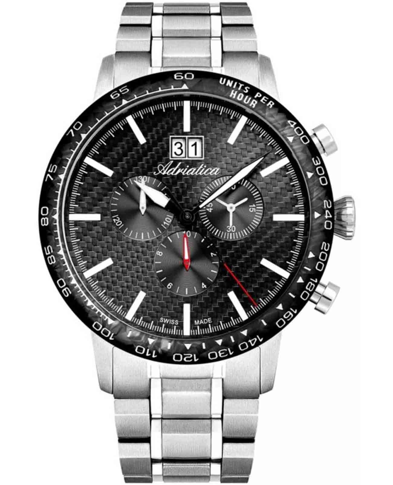 Мужские швейцарские часы-хронографХронографФункция позволяет измерять отрезки времени с особой точностью: часы, минуты, секунды. Верным признаком хронографа является наличие на циферблате 3 дополнительных окошек-счётчиков. с секундомеромСекундомерСекундоме́р — прибор, способный измерять интервалы времени с точностью до долей секунды. и тахиметромТахиметрРазмеченная шкала, располагается на ободке или безеле часов. Тахиметр позволяет рассчитать скорость на определённом участке пути, расстояние измеряется в километрах или милях. Adriatica Aviation A8383.4114CH воплощают в себе элегантность и функциональность, их выбирают целеустремленные мужчины, которые знают цену времени. Черный циферблат часов, защищенный сапфировым стекломСапфировое стеклоПрочный и надёжный материал из кристалла сапфира синтетического происхождения, характеризующийся особой твёрдостью и устойчивостью к царапинам и повреждениям., заключен в корпус из титана диаметром 46 мм и толщиной 12 мм. Надежный кварцевый механизм с калибром Ronda 5040.B обеспечивает высокую точность, а водозащита 5 ATM делает часы устойчивыми к воздействию воды. Стальной браслет с раскладной застёжкойРаскладная застёжкаТакой тип застёжки используется только на браслетах из металла. Она никогда не раскрывается полностью, происходит разделение на 2 и более частей. Раскладывающая застёжка снизит вероятность потери часов к минимуму. обеспечивает комфортное и надежное ношение. Циферблат с метками в виде штрихов имеет 3 дополнительных циферблата, а также окошко даты в положении «12» , что добавляет практичности в повседневной жизни. Люминесцентное покрытиеЛюминесцентное покрытиеПозволяет считывать показания времени в темноте. Производители наносят на стрелки, часовые индексы, безель или поверхность циферблата светонакопительный состав, дающий холодное свечение. на стрелках и метках обеспечивает отличную видимость в темноте.