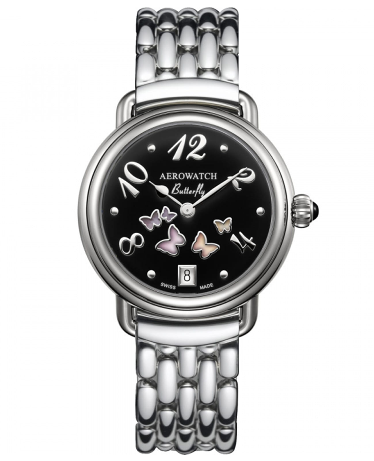 Женские швейцарские часы Aerowatch 1942 44960 AA03 M, кварцевый механизм с высокой точностью. Сапфировое стеклоСапфировое стеклоПрочный и надёжный материал из кристалла сапфира синтетического происхождения, характеризующийся особой твёрдостью и устойчивостью к царапинам и повреждениям. устойчивое к появлению царапин, обладающее высокой прозрачностью. Корпус и браслет изготовлены из нержавеющей стали Стильный черный циферблат украшают 5 бабочек, которые меняют свой цвет в течение суток, благодаря вращающемуся внутри диску, окошко даты в положении 6 часов. Класс водозащиты: 50 метров, позволит защитить корпус от случайных брызг или капель дождя. Стальной браслет на застёжке «бабочка» с кнопкамиЗастёжка "бабочка"Такой вид застёжки дополняется предохранителями, помогающими избежать случайного раскрытия браслета. Обладают изящным исполнением. .