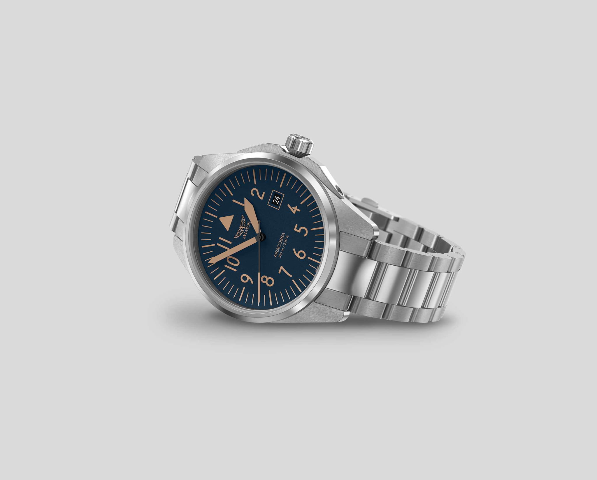 Aviator V.1.38.0.318.5 “Airacobra 43 Type A” — надёжные швейцарские пилотские часы с насыщенным функционалом и строгим авиационным дизайном. Корпус диаметром 42,8 мм выполнен из нержавеющей стали.