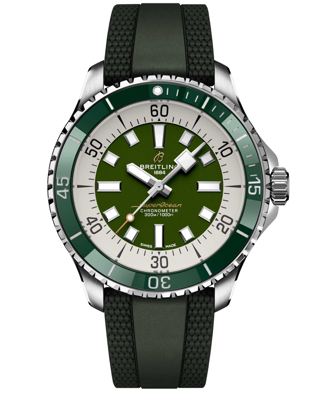 Мужские водонепроницаемые швейцарские часы Breitling Superocean Automatic 44 A17376A31L1S1, механический механизм (автоматический калибр) с высокой точностью. Сапфировое стеклоСапфировое стеклоПрочный и надёжный материал из кристалла сапфира синтетического происхождения, характеризующийся особой твёрдостью и устойчивостью к царапинам и повреждениям. устойчивое к появлению царапин, обладающее высокой прозрачностью. Класс водозащиты: 300 метров, позволит плавать, нырять и заниматься другими водными видами спорта. Корпус часов изготовлен из стали. Силиконовый ремешок с раскладной застёжкойРаскладная застёжкаТакой тип застёжки используется только на браслетах из металла. Она никогда не раскрывается полностью, происходит разделение на 2 и более частей. Раскладывающая застёжка снизит вероятность потери часов к минимуму.. Стрелки и метки с люминесцентным покрытиемЛюминесцентное покрытиеПозволяет считывать показания времени в темноте. Производители наносят на стрелки, часовые индексы, безель или поверхность циферблата светонакопительный состав, дающий холодное свечение.. Широкие стрелки и индексы с люминесцентным покрытиемЛюминесцентное покрытиеПозволяет считывать показания времени в темноте. Производители наносят на стрелки, часовые индексы, безель или поверхность циферблата светонакопительный состав, дающий холодное свечение. обеспечивают легкую читаемость под водой. БезельБезельВнешний ободок, закрепляющий стекло. В спортивных часах так называется поворотное кольцо с делениями на циферблате, выполняет роль таймера – замеряет отрезки времени на шкале. Неподвижный безель – элемент декора. Однонаправленно вращающийся безель на дайверских часах позволяет фиксировать моменты погружения и выныривания на поверхность. из стали с керамической инкрустацией, защищенный от царапин, никогда не изнашивается и не выцветает. Лучше всего то, что это больше не просто часы для дайвинга — занимайтесь с ними серфингом, плавайте с ними, заходите с ними в пляжный бар, а затем надевайте их на ужин. Superocean идеально сочетает ностальгию по своему наследию со свежим внешним видом.
