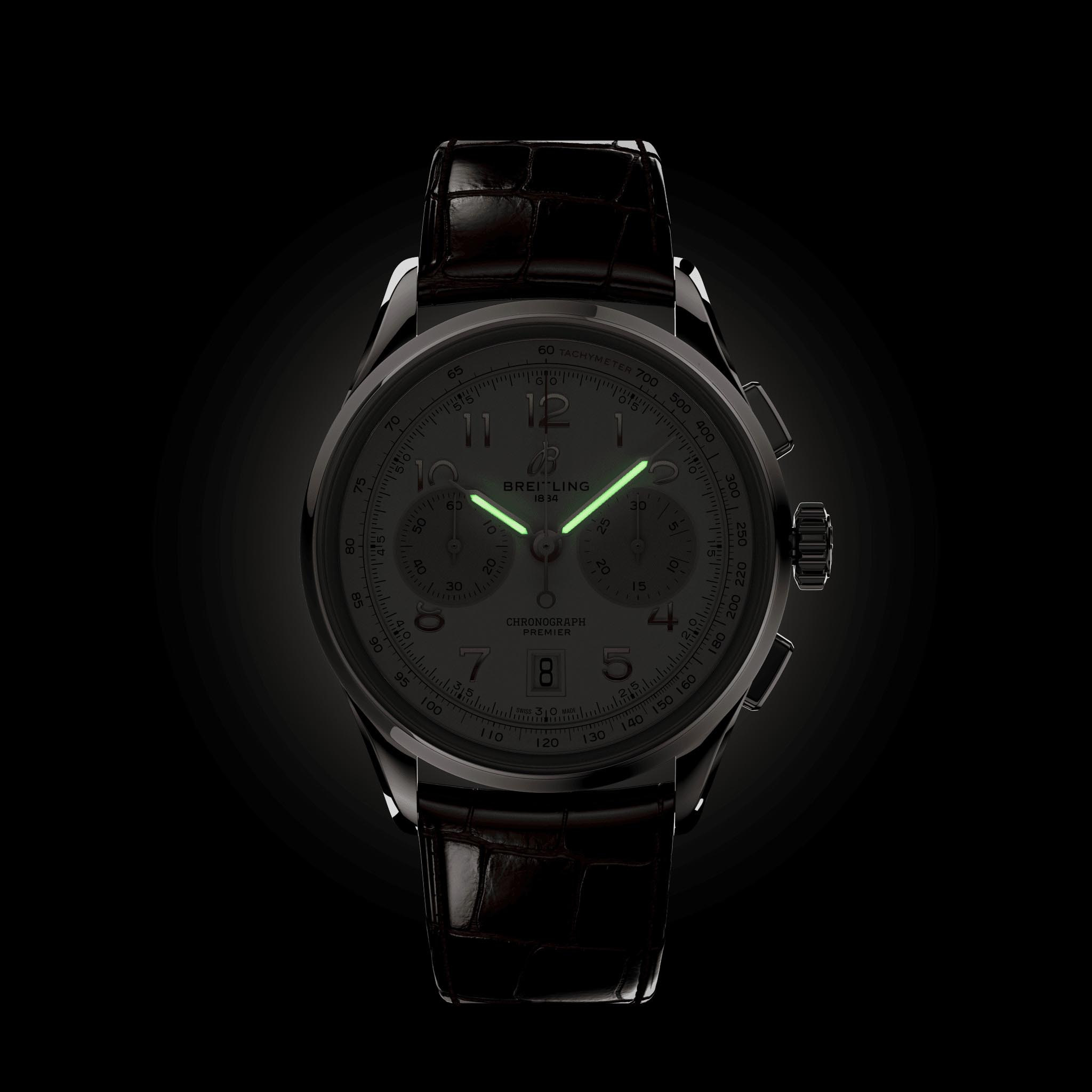 Мужские швейцарские часы-хронографХронографФункция позволяет измерять отрезки времени с особой точностью: часы, минуты, секунды. Верным признаком хронографа является наличие на циферблате 3 дополнительных окошек-счётчиков. с тахиметромТахиметрРазмеченная шкала, располагается на ободке или безеле часов. Тахиметр позволяет рассчитать скорость на определённом участке пути, расстояние измеряется в километрах или милях. Breitling Premier B01 Chronograph 42 AB0145211G1P1, механический механизм (автоматический калибр) с высокой точностью. Сапфировое стеклоСапфировое стеклоПрочный и надёжный материал из кристалла сапфира синтетического происхождения, характеризующийся особой твёрдостью и устойчивостью к царапинам и повреждениям. с антибликовым покрытием устойчивое к появлению царапин, обладающее высокой прозрачностью. Класс водозащиты: 100 метров, позволит плавать, нырять и заниматься другими водными видами спорта. Корпус часов изготовлен из стали. Кожаный крокодиловый ремешок с раскладной застёжкойРаскладная застёжкаТакой тип застёжки используется только на браслетах из металла. Она никогда не раскрывается полностью, происходит разделение на 2 и более частей. Раскладывающая застёжка снизит вероятность потери часов к минимуму.. Стрелки с люминесцентным покрытиемЛюминесцентное покрытиеПозволяет считывать показания времени в темноте. Производители наносят на стрелки, часовые индексы, безель или поверхность циферблата светонакопительный состав, дающий холодное свечение.. Окошко даты находится в положении 6 часов. СекундомерСекундомерСекундоме́р — прибор, способный измерять интервалы времени с точностью до долей секунды..