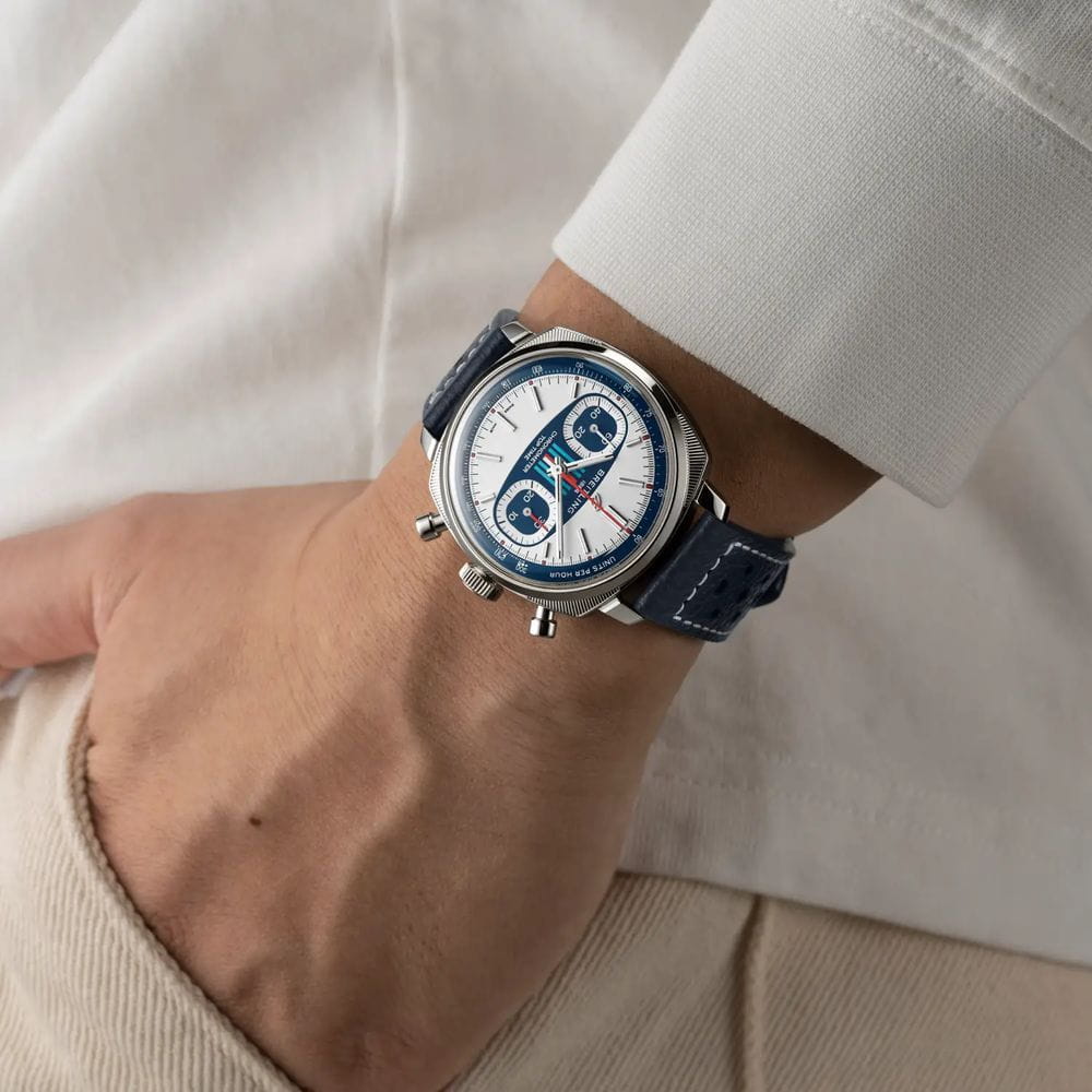 Breitling Top Time B31 AB01772A1G1X1 — стильная новинка 2025 года с характерной винтажной эстетикой и современным механизмом собственного производства. Корпус диаметром 38 мм выполнен из нержавеющей стали с полированной отделкой. Циферблат защищён выпуклым сапфировым стекломСапфировое стеклоПрочный и надёжный материал из кристалла сапфира синтетического происхождения, характеризующийся особой твёрдостью и устойчивостью к царапинам и повреждениям. с двухсторонним антибликовым покрытиемАнтибликовое покрытиеСлой оксида металла в 0,13-0,3 микрон, благодаря которому стекло часов не бликует и не отражает свет. Антибликовое покрытие уменьшает отражение света в 10 раз, обеспечивая отличную читаемость показателей циферблата.. Циферблат с контрастным внутренним кольцом и яркой оранжевой секундной стрелкой оформлен в узнаваемом стиле коллекции Top Time. Стрелки и часовые метки имеют люминесцентное покрытиеЛюминесцентное покрытиеПозволяет считывать показания времени в темноте. Производители наносят на стрелки, часовые индексы, безель или поверхность циферблата светонакопительный состав, дающий холодное свечение., обеспечивающее отличную читаемость. Внутри установлен автоматический калибр Breitling B31, отображающий часы, минуты, малую секунду и дату. Механизм обеспечивает запас хода до 78 часов и работает с частотой 28 800 полуколебаний в час. Часы укомплектованы перфорированным кожаным ремешком и классической застёжкой-пряжкой. Водонепроницаемость 100 метров делает модель универсальной для повседневного использования. Top Time B31 AB01772A1G1X1 — гармония винтажного дизайна и инновационного часового мастерства.
