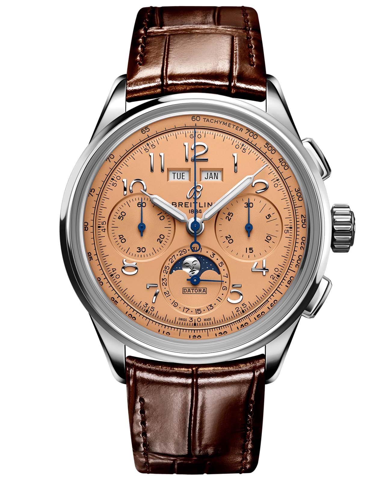 Термин «Datora» появился в 1940-х годах в компании Breitling для обозначения хронографа с полным календарем, отображающим день, дату, месяц и различные фазы Луны. Часы оснащены мануфактурным механизмом Breitling B25, сертифицированным Швейцарским институтом официального тестирования хронометров (COSC).