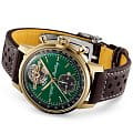 Мужские наручные часы c хронографомХронографФункция позволяет измерять отрезки времени с особой точностью: часы, минуты, секунды. Верным признаком хронографа является наличие на циферблате 3 дополнительных окошек-счётчиков. Breitling Top Time B21 Ford Mustang NB21251A1L1X1, надежный автоматический механизм. Корпус часов изготовлен из бронзы. Практичный кожаный ремешок на стандартной застёжке. ТахиметрТахиметрРазмеченная шкала, располагается на ободке или безеле часов. Тахиметр позволяет рассчитать скорость на определённом участке пути, расстояние измеряется в километрах или милях., сапфировое стеклоСапфировое стеклоПрочный и надёжный материал из кристалла сапфира синтетического происхождения, характеризующийся особой твёрдостью и устойчивостью к царапинам и повреждениям. повышенной прозрачности, устойчивое к мелким механическим повреждениям. Стрелки и метки с люминесцентным покрытиемЛюминесцентное покрытиеПозволяет считывать показания времени в темноте. Производители наносят на стрелки, часовые индексы, безель или поверхность циферблата светонакопительный состав, дающий холодное свечение..