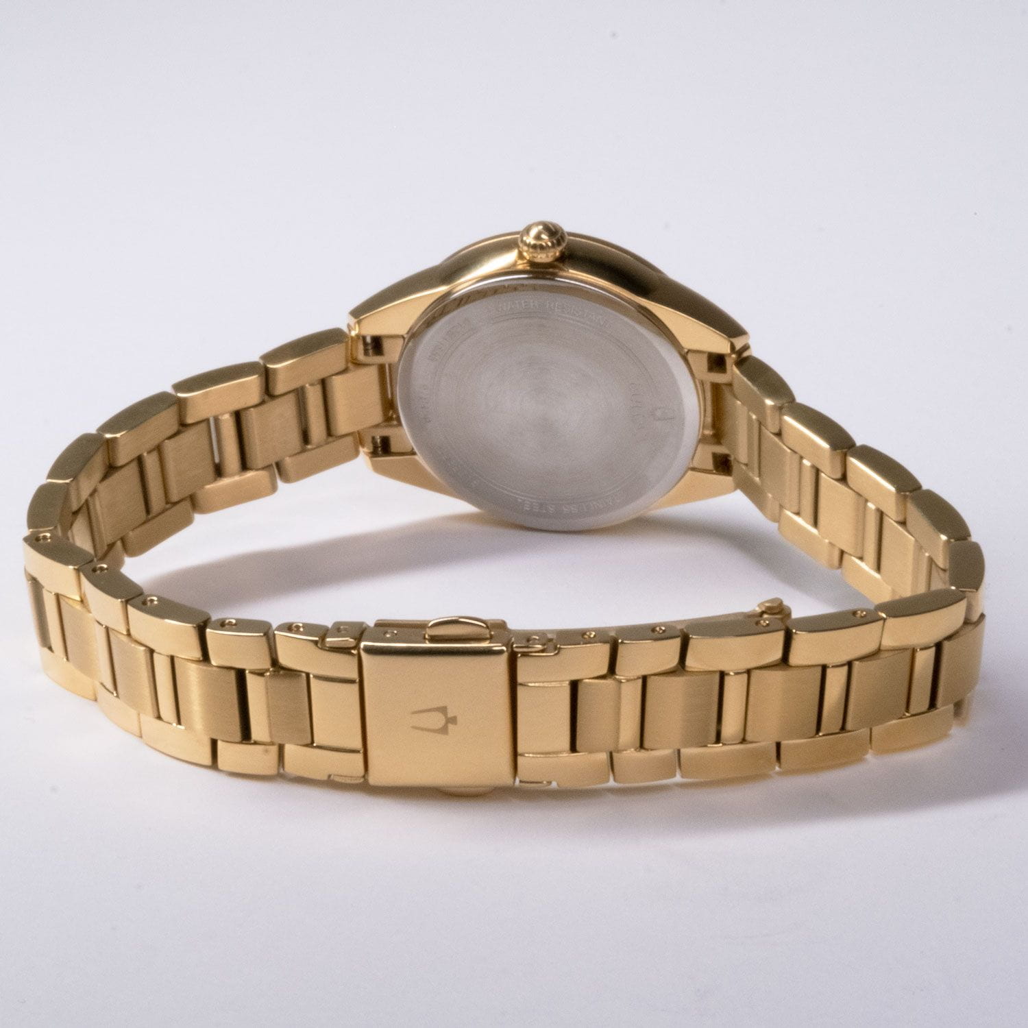 Женские кварцевые часы Bulova Sutton 97P150 – отражающий идеальное сочетание современного дизайна, надёжности и функциональности. Элегантный облик станет превосходным завершением образа, наделив его индивидуальным характером. Корпус из нержавеющей стали с PVD-покрытиемPVDУльтратонкое покрытие наносится в технике вакуумного напыления, сочетает в себе нитрид титана особой прочности со слоем золота или оксида хрома. Несёт в себе декоративную или защитную функцию. золотистого цвета, диаметром 28 мм идеально сбалансирован и элегантен. Минеральное стеклоМинеральное стеклоМинеральное стекло представляет собой искусственно выращенный минерал кварца. Такое стекло отличается особой устойчивостью к повреждениям и царапинам. Уступает по некоторым качествам сапфировому стеклу. защищает циферблат от царапин и устойчивое к мелким механическим повреждениям. Серебристый циферблат украшен бриллиантами. Стальной браслет с PVD-покрытиемPVDУльтратонкое покрытие наносится в технике вакуумного напыления, сочетает в себе нитрид титана особой прочности со слоем золота или оксида хрома. Несёт в себе декоративную или защитную функцию. на раскладной застёжкеРаскладная застёжкаТакой тип застёжки используется только на браслетах из металла. Она никогда не раскрывается полностью, происходит разделение на 2 и более частей. Раскладывающая застёжка снизит вероятность потери часов к минимуму. обеспечивает комфортное ношение. Водозащита 30 метров позволит защитить корпус от случайных брызг или капель дождя. Эта модель – отличный выбор для тех, кто ищет сочетание стиля, качества и функциональности. Часы станут не только полезным аксессуаром, но и выразительным элементом вашего имиджа.