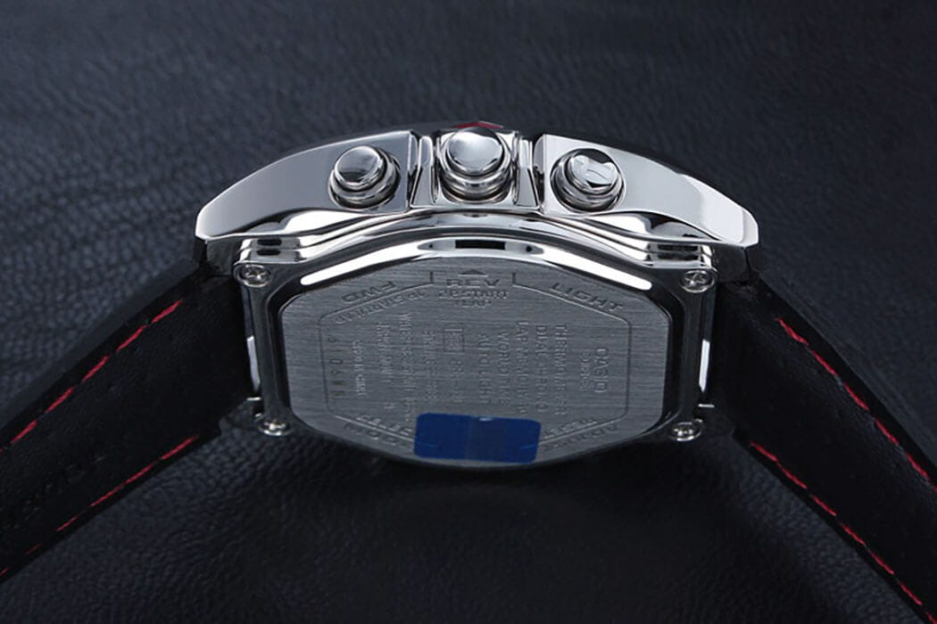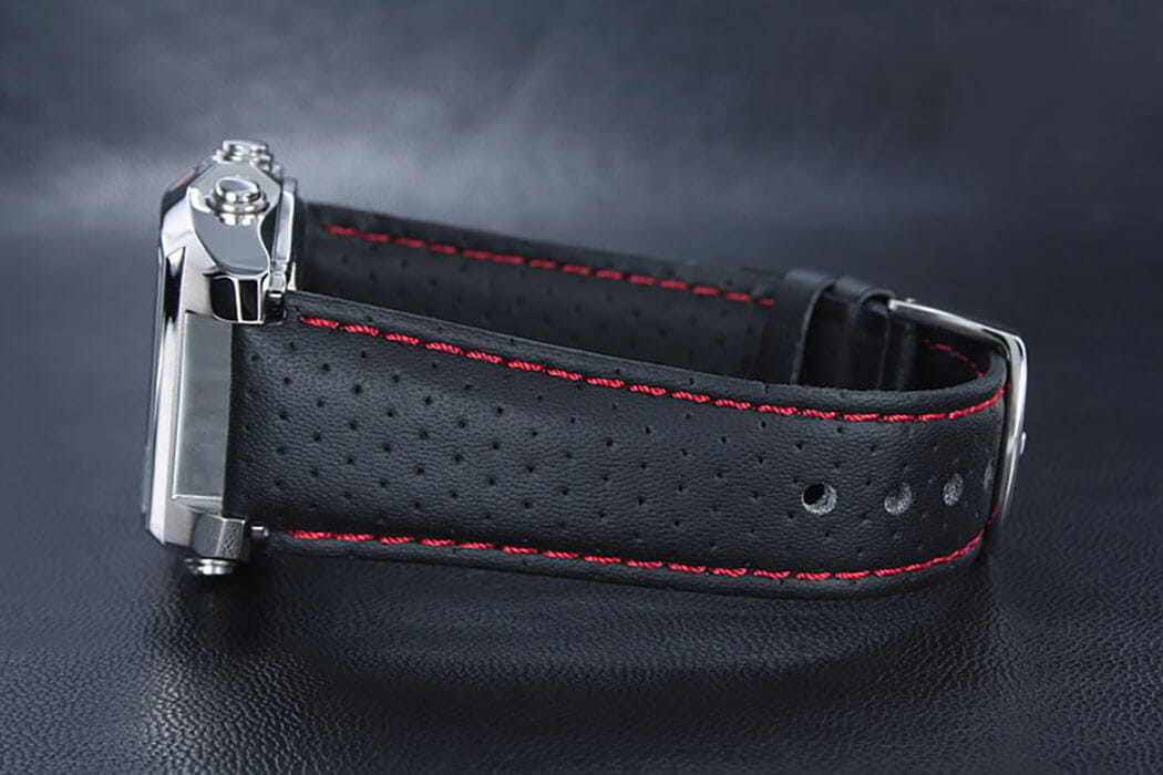 Стильный аксессуар имеет необычный дизайн в футуристическом стиле, присутствуют контрастные элементы. Выдержана общая автомобильная тематика, такое исполнение сохраняет актуальность уже много сезонов подряд. Модель станет идеальным вариантом для путешественников и спортсменов благодаря часовым усложнениям: термометр, мировое времяМировое время Полезное часовое усложнение, отображающее время в основных городах и известных областях по всему миру, оно связано с часовыми поясами, удобно для путешественников и бизнесменов. , секундомер, таймер, календарь, будильник. Память на 50 кругов - позволяет измерять время тренировки. Выпуклое минеральное стекло. Водостойкость 100 метров. Корпус из нержавеющей стали 316L. Перфорированный ремешок из натуральной кожи. Габариты: 43,9 x 38,3 x 12,9 мм.