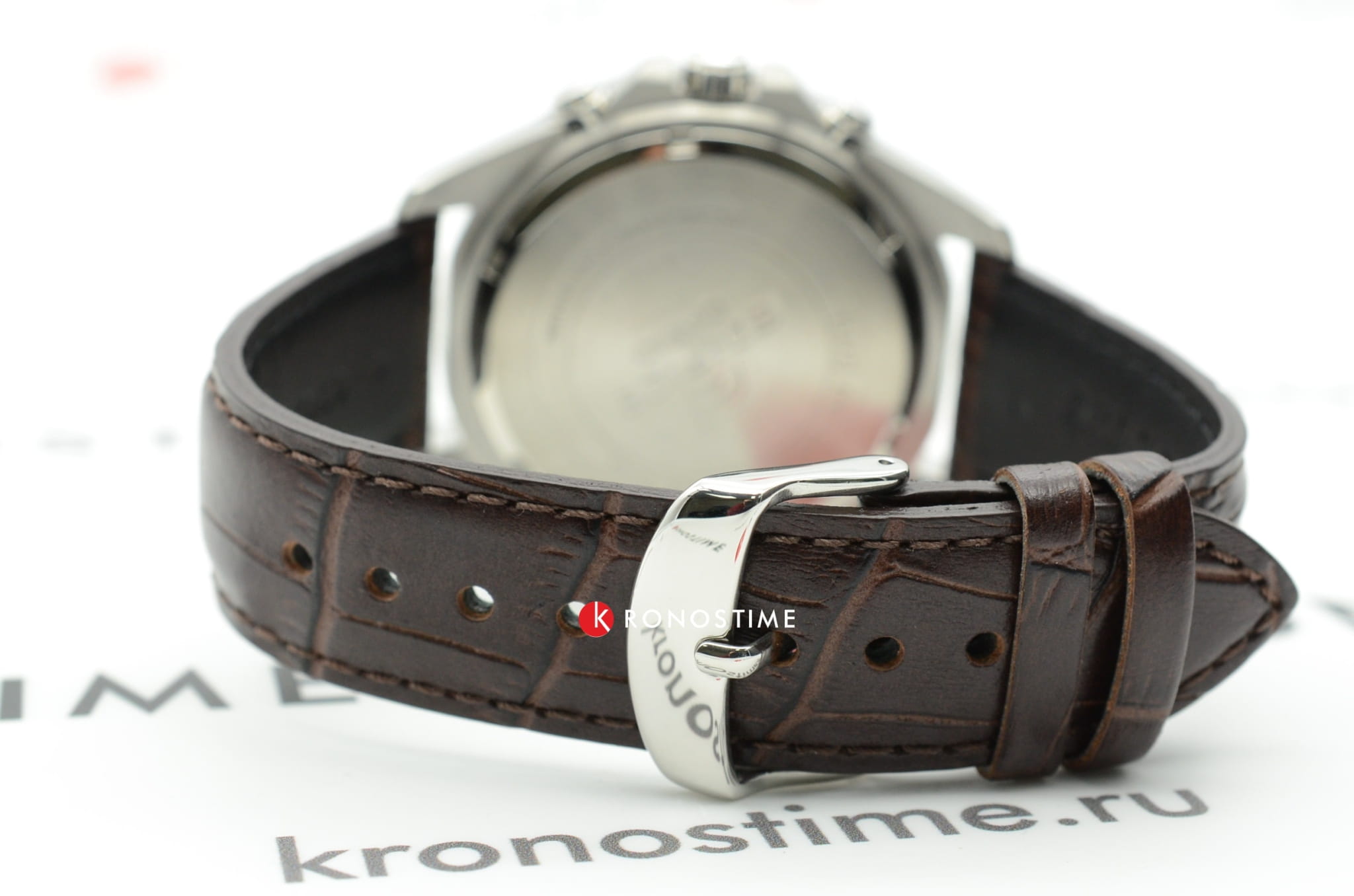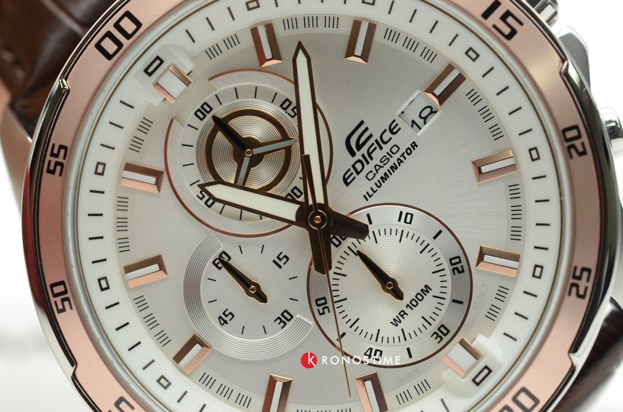 Практичный и надёжный аксессуар стильно смотрится на запястье и подходит к любой одежде. Светлый циферблат дополнен контрастными стрелками, часовыми метками и счётчиками, что обеспечивает идеальную читаемость показателей. Особую привлекательность представляет собой безельБезельВнешний ободок, закрепляющий стекло. В спортивных часах так называется поворотное кольцо с делениями на циферблате, выполняет роль таймера – замеряет отрезки времени на шкале. Неподвижный безель – элемент декора. Однонаправленно вращающийся безель на дайверских часах позволяет фиксировать моменты погружения и выныривания на поверхность. цвета розового золота. Высокоточный кварцевый механизм Miyota с точностью хода +/- 15 сек/мес. Коричневый ремешок из натуральной кожи. Закаленное минеральное стекло. Люминесцентная подсветкаЛюминесцентное покрытиеПозволяет считывать показания времени в темноте. Производители наносят на стрелки, часовые индексы, безель или поверхность циферблата светонакопительный состав, дающий холодное свечение.. Водонепроницаемость до 100 метров. Отображение даты, секундомер. Габариты: 47,2 x 54 x 13,9 мм.