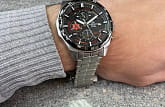 Крупный чёрный циферблат имеет красные и голубые элементы, каждая деталь навеивает мысли о приборной панели автомобиля. Броский аксессуар станет стильным завершением индивидуального образа, наделив его спортивными чертами. Яркий хронографХронографФункция позволяет измерять отрезки времени с особой точностью: часы, минуты, секунды. Верным признаком хронографа является наличие на циферблате 3 дополнительных окошек-счётчиков. оснащён кварцевым механизмом с высокой точностью хода. Заводная головка с защитой и завинчивающаяся задняя крышка дополнительно способствуют сохранению водонепроницаемости до 10 бар. Минеральное стекло. Секундомер, окошко даты. Люминесцентная подсветкаЛюминесцентное покрытиеПозволяет считывать показания времени в темноте. Производители наносят на стрелки, часовые индексы, безель или поверхность циферблата светонакопительный состав, дающий холодное свечение.. Корпус из нержавеющей стали с частичным IP-покрытиемIP-покрытиеМетод ионного напыления. Демонстрирует повышенную устойчивость к истиранию, окислению и химическим веществам. Под воздействием высокого давления и температуры около 1500°C молекулы металла надёжно соединяются с частицами корпуса часов.. Габариты: 53,5 x 48,7 x 12,6 мм.