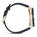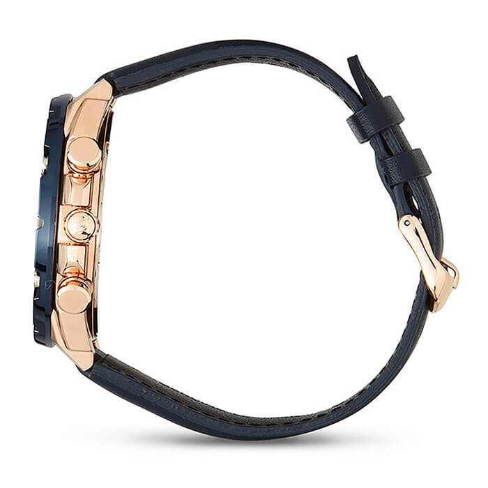 Аналоговый синий циферблат с крупными элементами и счётчиками дополнен массивным стальным безелемБезельВнешний ободок, закрепляющий стекло. В спортивных часах так называется поворотное кольцо с делениями на циферблате, выполняет роль таймера – замеряет отрезки времени на шкале. Неподвижный безель – элемент декора. Однонаправленно вращающийся безель на дайверских часах позволяет фиксировать моменты погружения и выныривания на поверхность. оригинальной формы. Наручные часы дополнены ремешком из натуральной кожи в тон циферблату. Завинчивающаяся задняя крышка и заводная головка способствуют высокой водонепроницаемости при давлении 10 бар. 1 батарейка обеспечивает бесперебойную работу часов в течение 3 лет. Люминесцентная подсветкаЛюминесцентное покрытиеПозволяет считывать показания времени в темноте. Производители наносят на стрелки, часовые индексы, безель или поверхность циферблата светонакопительный состав, дающий холодное свечение.. Секундомер, хронографХронографФункция позволяет измерять отрезки времени с особой точностью: часы, минуты, секунды. Верным признаком хронографа является наличие на циферблате 3 дополнительных окошек-счётчиков., прямоугольное окошко даты. Габариты: 51 x 48,4 x 12,1 мм.