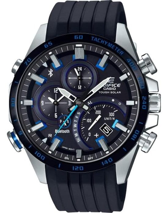 Общее исполнение аксессуара выдержано в автомобильной стилистике, тёмный циферблат отличается оригинальным расположением счётчиков. Наручные часы оснащены технологией BluetoothBluetoothСовременная технология, позволяющая синхронизировать часы с телефоном и переносить данные. Часы с Bluetooth расширяют возможности вашего смартфона и делают его использование ещё более удобным. с низким потреблением энергии, позволяющей часам считывать информацию с интернет-сервера точного времени и обеспечивать абсолютную точность времени. Питание происходит за счёт солнечной батареи - . Водонепроницаемость 100 метров. Минеральное стекло. Люминесцентная подсветкаЛюминесцентное покрытиеПозволяет считывать показания времени в темноте. Производители наносят на стрелки, часовые индексы, безель или поверхность циферблата светонакопительный состав, дающий холодное свечение.. Надёжный полимерный ремешок. Наличие авиарежима. БезельБезельВнешний ободок, закрепляющий стекло. В спортивных часах так называется поворотное кольцо с делениями на циферблате, выполняет роль таймера – замеряет отрезки времени на шкале. Неподвижный безель – элемент декора. Однонаправленно вращающийся безель на дайверских часах позволяет фиксировать моменты погружения и выныривания на поверхность. с чёрным IP-покрытиемIP-покрытиеМетод ионного напыления. Демонстрирует повышенную устойчивость к истиранию, окислению и химическим веществам. Под воздействием высокого давления и температуры около 1500°C молекулы металла надёжно соединяются с частицами корпуса часов.. Функции: уведомление о полученных сообщениях по электронной почте, поиск телефона, отображение числа и дня недели, секундомер, будильник, тахиметрТахиметрРазмеченная шкала, располагается на ободке или безеле часов. Тахиметр позволяет рассчитать скорость на определённом участке пути, расстояние измеряется в километрах или милях., расчёт средней скорости пройденного маршрута. Габариты: 52 x 48,1 x 14,2 мм.