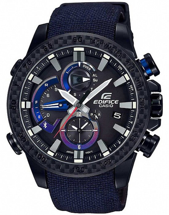 Основным источником дизайнерского воплощения и технических параметров выступает автоспорт Благодаря чему в часах EQB-800 применяется современное конструктивное решение Casio ConnectedEngine, предоставляющее возможность синхронизации с другими устройствами Во внешнем облике явно прослеживается характерный спортивный почерк: