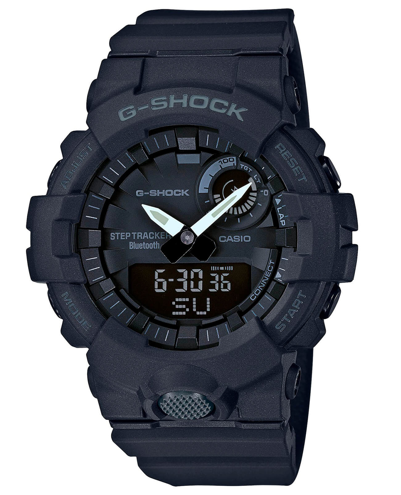 Часы в черном противоударном корпусеУдаропрочный корпусМеханизм заключён в корпус, выполненный из современных материалов, устойчивых к ударам, механическим повреждениям и падению с высоты: инновационный пластик, карбон, нержавеющая сталь, титан. и с минималистичным оформлением циферблата дополнят ваш образ динамичностью и брутальным характером. Модель не лишена функциональности, это первые часы G-Shock, оснащённые трекером активности. Также среди часовых усложнений BluetoothBluetoothСовременная технология, позволяющая синхронизировать часы с телефоном и переносить данные. Часы с Bluetooth расширяют возможности вашего смартфона и делают его использование ещё более удобным., таймер, секундомер, расчёт средней скорости пути, мировое времяМировое время Полезное часовое усложнение, отображающее время в основных городах и известных областях по всему миру, оно связано с часовыми поясами, удобно для путешественников и бизнесменов. , будильник, автоматический календарь. Срок службы батарейки - 2 года. Светодиодная подсветкаСветодиодная подсветкаСветодиодная или LED-подсветка обеспечивает появление яркого холодного свечения за счёт LED-элементов - маленьких лампочек. Они потребляют минимальное количество энергии, чаще всего можно встретить 1 светодиод, в нижней части циферблата. циферблата. Минеральное стекло. Корпус и браслет из полимерного материала. Водостойкость 20 бар. Габариты: 54,1 x 48,6 x 15,5 мм.