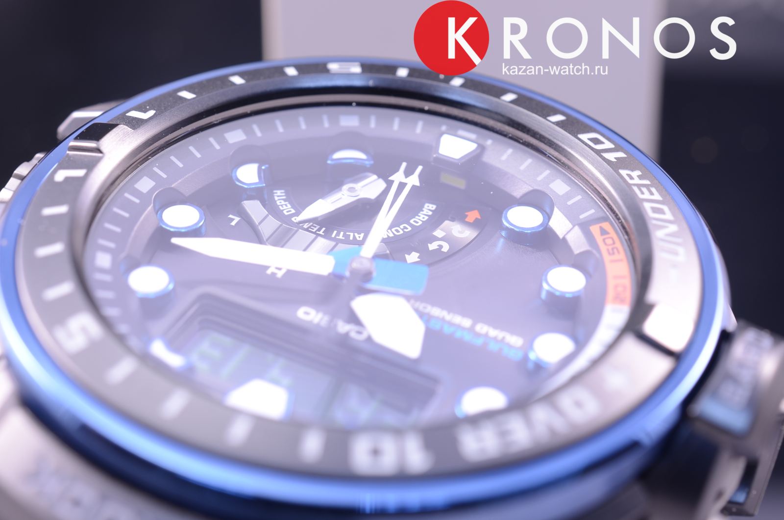 Современные японские наручные мужские часы. Круглый корпус и браслет часов выполнены из полимерного пластика синего цвета, безель часов из нержавеющей стали с антикоррозийными свойствами.  Водонепроницаемость 20 ATM. Сапфировое стекло, устойчивое к появлению царапин. Часы снабжены множеством дополнительных функций - барометр, высотомер, компас, термометр, рдиосинхронизация времени, глубиномер, данные о восходе и закате солнца. Источник энергии - солнечная батарея.