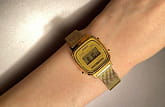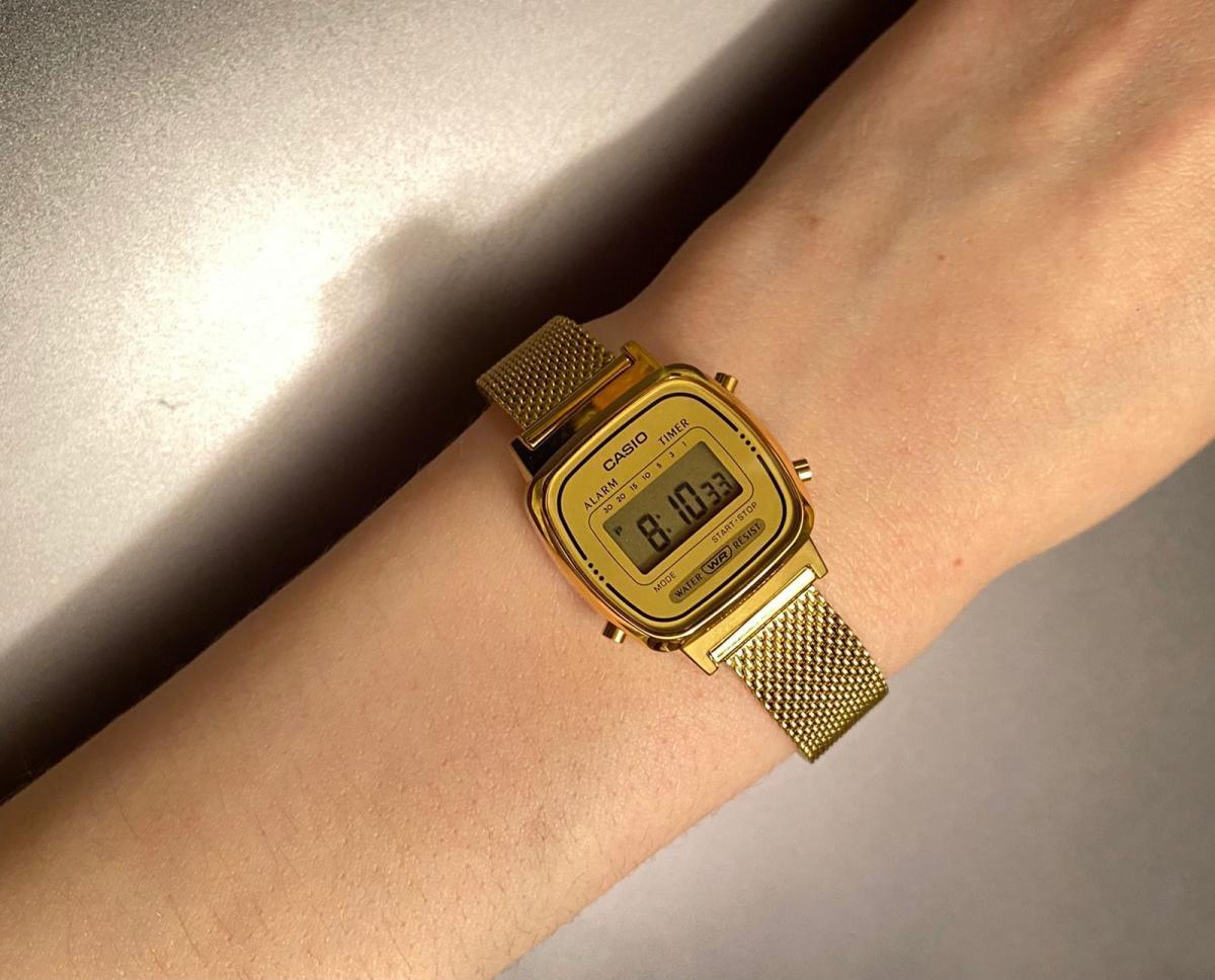 Спортивные женские наручные часы с электронным циферблатом. Оснащены функциями: секундомера, таймера, календаря и подсветки. Корпус - Нержавеющая сталь, PVD покрытие; Стекло - Пластик; Водозащита - 30 м. (WR 30); Материал ремешка - Нержавеющая сталь, PVD покрытие; Цвет ремешка -Желтый; Цвет циферблата - Lcd.