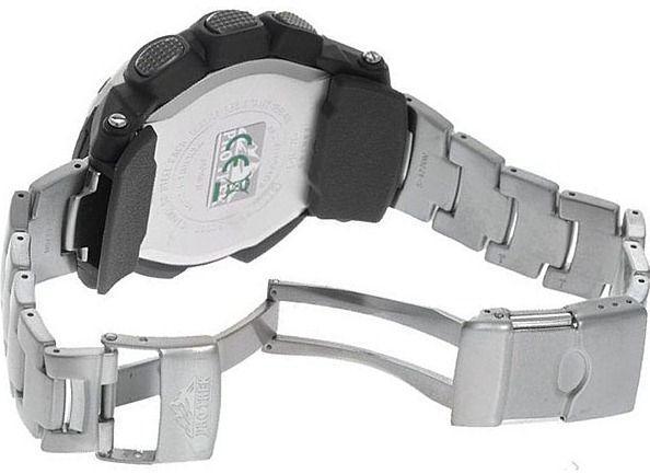 Многофункциональные часы с противоударной конструкцией и хорошей водозащитой. Часы работают на солнечных элементах. Cветодиодная подсветка автоматически включается при тусклом, темном свете и отключается при хорошем освещении. Часы рассчитаны на работу при температуре ниже нуля. В режиме "Мировое время" можно просмотреть местное время в некоторых основных городах и определенных регионах мира. В режиме Секундомера можно фиксировать отдельные отрезки времени с точностью показаний 1/100 сек и временем измерения 24 часа. Часы оснащены цифровым компасом, альтиметром, барометром, датчиком температуры. Альтиметр – датчик барометрического давления с выводом результата в единицах высоты над уровнем моря. Максимальная высота измерения – 10000 метров над уровнем моря. Индикатор уровня заряда элемента питания. Календарь автоматический: автоматически учитываются месяцы разной продолжительности и високосные годы. Габаритные размеры - 56,8х49,3х14,3. Вес 113г.