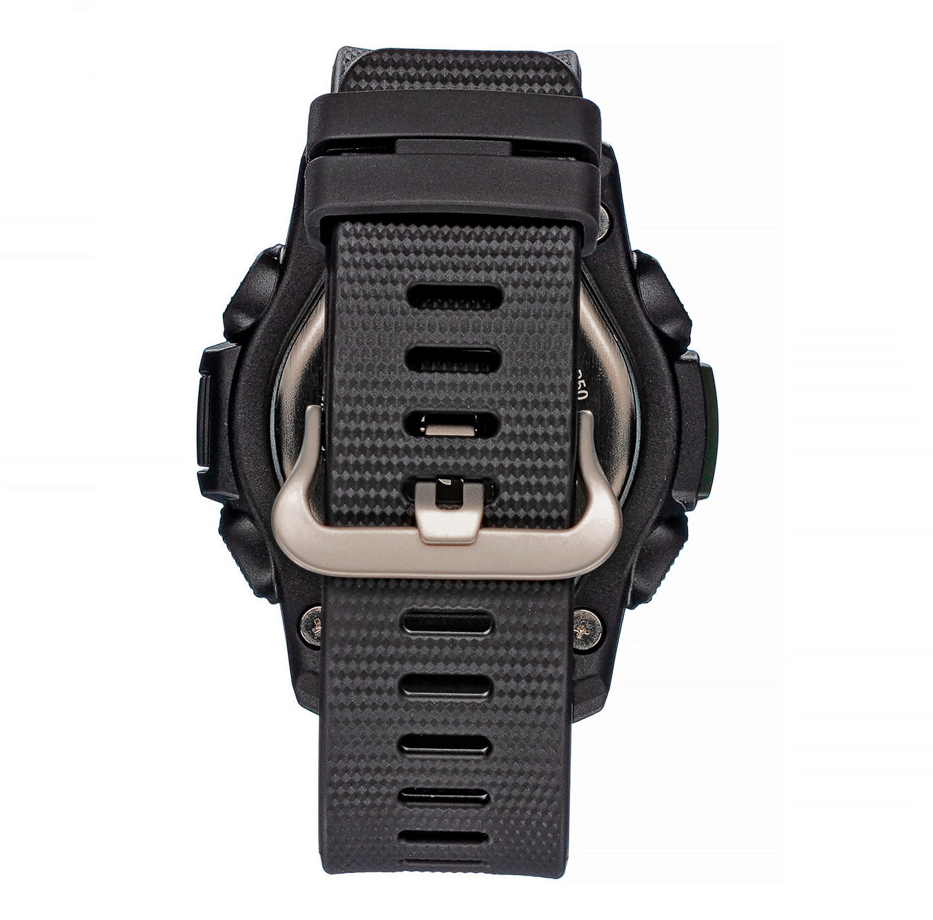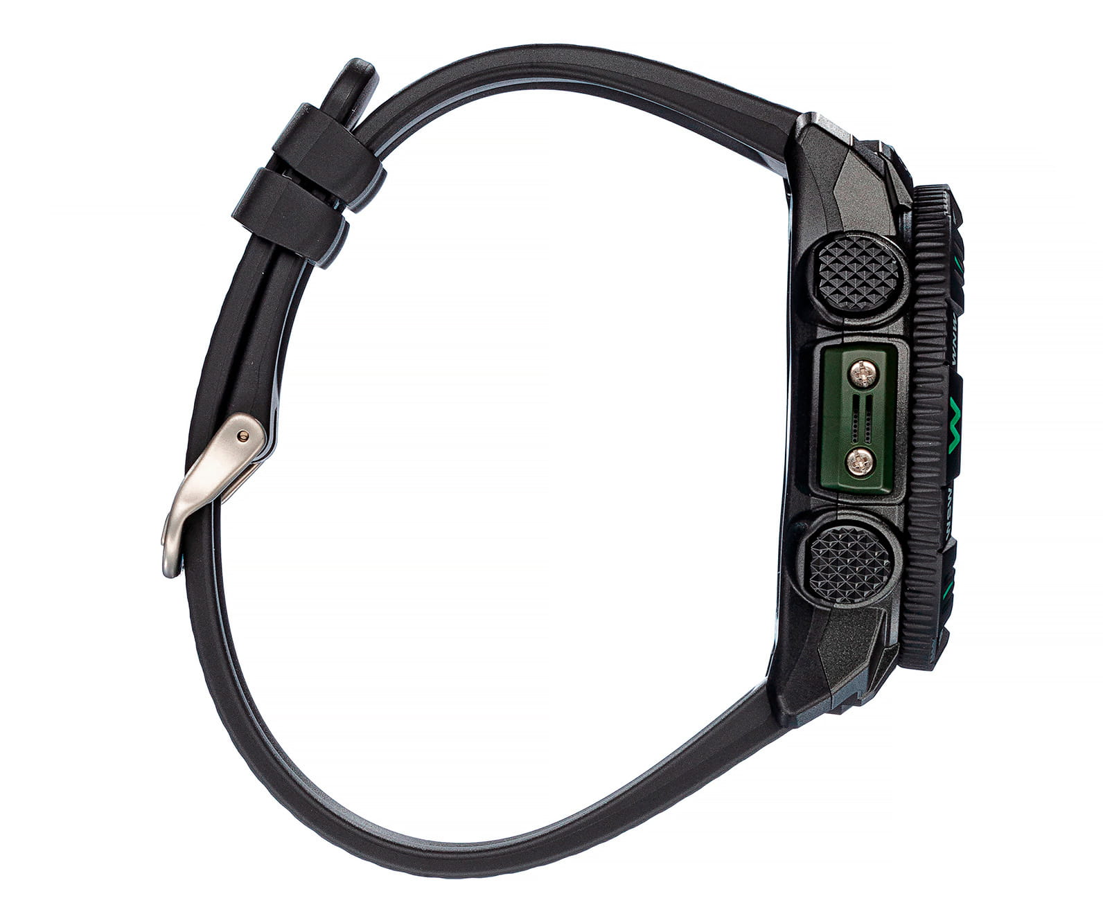 , будильник, хронографХронографФункция позволяет измерять отрезки времени с особой точностью: часы, минуты, секунды. Верным признаком хронографа является наличие на циферблате 3 дополнительных окошек-счётчиков., поиск телефона. Часы синхронизируются со смартфоном с помощью технологии Bluetooth® SmartBluetoothСовременная технология, позволяющая синхронизировать часы с телефоном и переносить данные. Часы с Bluetooth расширяют возможности вашего смартфона и делают его использование ещё более удобным.. Японский кварцевый механизм. Срок службы батарейки – 2 года. Минеральное стекло. Двойная электролюминесцентная подсветкаЭлектролюминесцентная подсветкаЭлектролюминесцентная панель устанавливается под ЖК-экраном часов, при нажатии кнопки электричество преобразуется в свет за счёт подачи напряжения на атомы фосфора, такой тип подсветки позволяет освещать весь циферблат.. Отключение и включение звука кнопок. Сохранение работоспособности при температуре ниже -10°C. Водозащита 100 метров. Ударопрочный корпусУдаропрочный корпусМеханизм заключён в корпус, выполненный из современных материалов, устойчивых к ударам, механическим повреждениям и падению с высоты: инновационный пластик, карбон, нержавеющая сталь, титан. и ремешок из полимерного материала. Габариты: 57,5 x 50,8 x 15,8 мм.