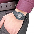 Питание электронная модель получает от батарейки, которая характеризуется 10-летним сроком службы. Знаменитый 8-угольный корпус в чёрном цвете выполнен из прочного пластика, поглощающего воздействие вибраций при ударе. Возможна идеальная читаемость показателей со светлого циферблата благодаря светодиодной подсветкеСветодиодная подсветкаСветодиодная или LED-подсветка обеспечивает появление яркого холодного свечения за счёт LED-элементов - маленьких лампочек. Они потребляют минимальное количество энергии, чаще всего можно встретить 1 светодиод, в нижней части циферблата.. Гибкий ремешок из полимерного материала надёжно обхватывает запястье. Водонепроницаемость до 100 метров. Минеральное стекло. Будильник, секундомер. Габариты: 44,2 x 36,8 x 13,4 мм.