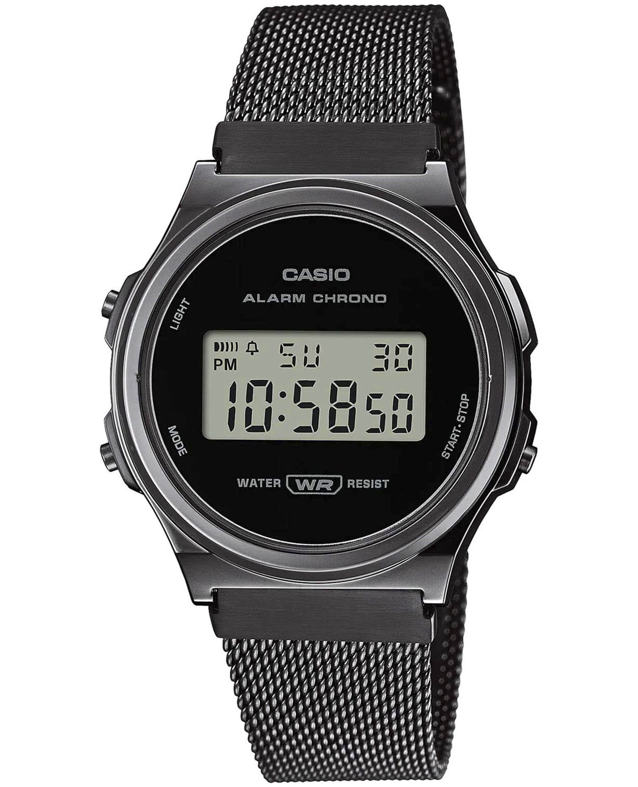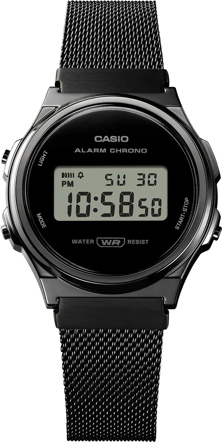 Спортивные японские мужские часы с секундомеромСекундомерСекундоме́р — прибор, способный измерять интервалы времени с точностью до долей секунды. Casio Vintage A171WEMB-1AEF, кварцевый механизм с высокой точностью. Издавая звуковой сигнал в установленное время, будильникБудильникБуди́льник — часы, в заданный момент времени подающие звуковой, световой и/или в редких случаях другой сигнал. напоминает о событиях, которые повторяются каждый день. Корпус из полимерного пластика. Класс водозащиты: 30 метров, позволит защитить корпус от случайных брызг или капель дождя. Ремешок с раскладной застёжкойРаскладная застёжкаТакой тип застёжки используется только на браслетах из металла. Она никогда не раскрывается полностью, происходит разделение на 2 и более частей. Раскладывающая застёжка снизит вероятность потери часов к минимуму.