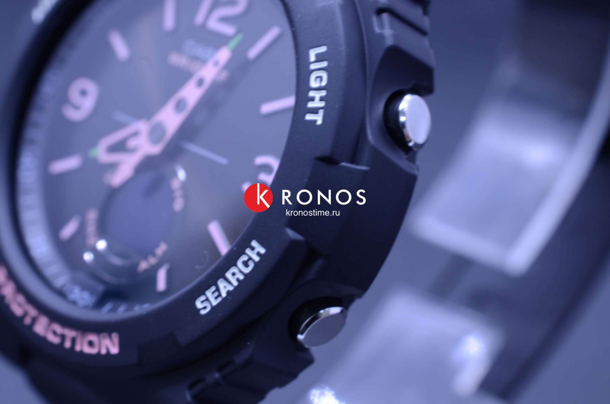Аксессуар точно оценят модницы, ведущие активный образ жизни. Лаконичный дизайн в спортивном стиле выражен в темном исполнении с розовыми акцентами. Оригинальные стрелки имеют яркие окончания с подсветкой NeobriteПодсветка NeobriteИспользование светонакопительных составов на основе сульфида цинка или алюмината стронция, яркий свет можно наблюдать на протяжении 6-10 часов после «зарядки» часов около источника света., что положительным образом сказывается на читаемости показателей. Японский кварцевый механизм получает питание от батарейки, рассчитанной на 3 года работы. Для подсветки используется LED-светодиодСветодиодная подсветкаСветодиодная или LED-подсветка обеспечивает появление яркого холодного свечения за счёт LED-элементов - маленьких лампочек. Они потребляют минимальное количество энергии, чаще всего можно встретить 1 светодиод, в нижней части циферблата.. Закаленное минеральное стекло. Водостойкость до 10 бар. Ударопрочный корпусУдаропрочный корпусМеханизм заключён в корпус, выполненный из современных материалов, устойчивых к ударам, механическим повреждениям и падению с высоты: инновационный пластик, карбон, нержавеющая сталь, титан. и гибкий ремешок из полимерного материала. Автоматический календарь, мировое времяМировое время Полезное часовое усложнение, отображающее время в основных городах и известных областях по всему миру, оно связано с часовыми поясами, удобно для путешественников и бизнесменов. , будильник с функцией «подремать», секундомер, таймер. Габариты: 48,1 x 42,4 x 12,3 мм.