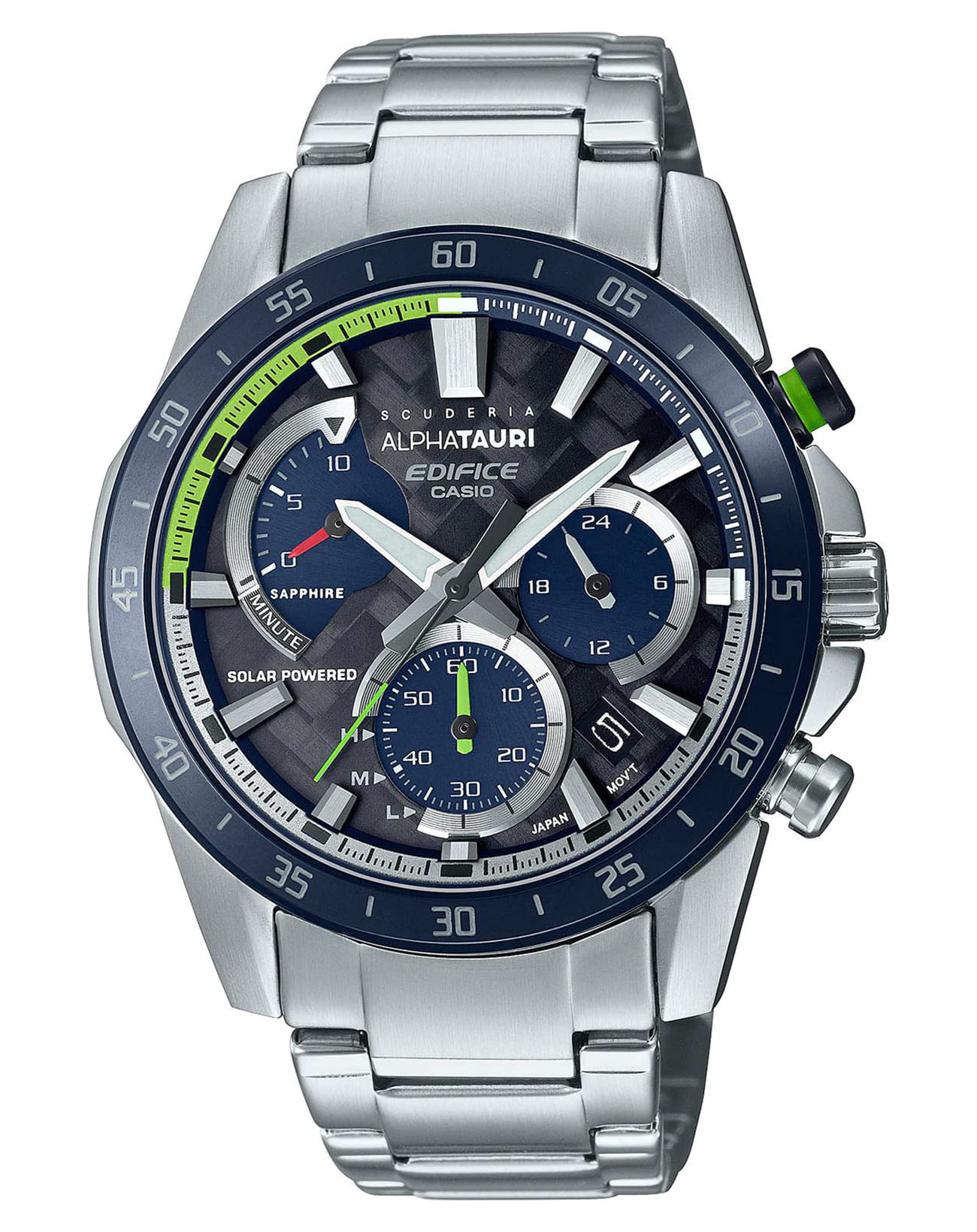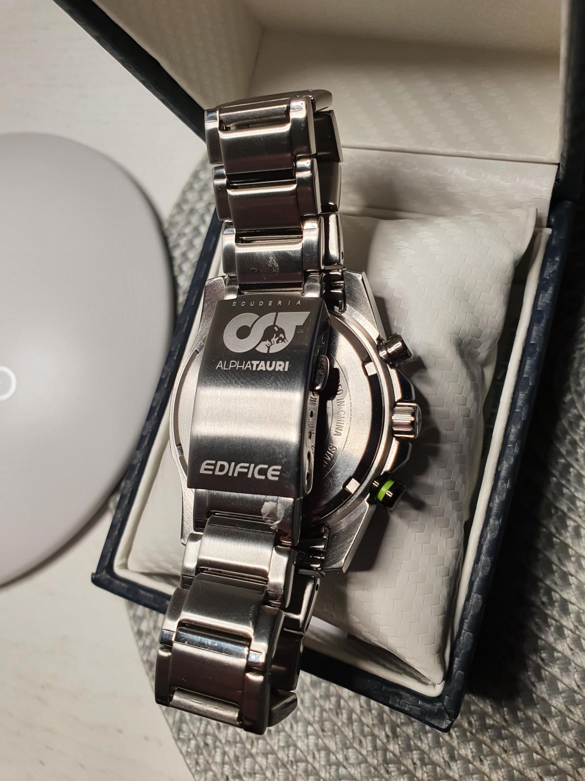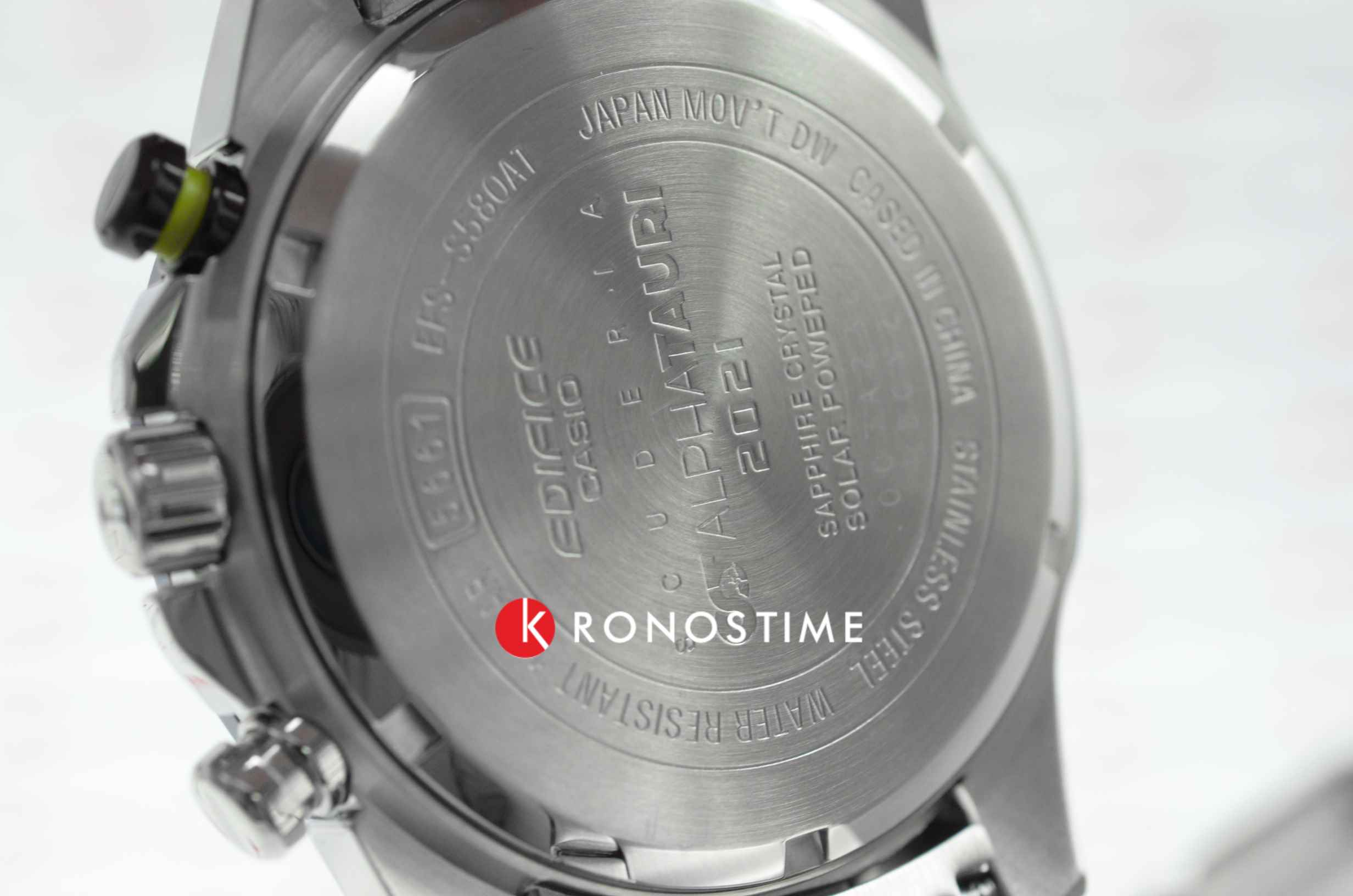 Часы Casio Edifice EFS-S580AT-1AER из лимитированной серии, созданной в коллаборации с итальянской гоночной командой Формулы-1 Scuderia AlphaTauri. Внутренний корпус часов изготовлен из того же углеродного волокна 6K, что используется в аэродинамических крыльях гоночной машины Scuderia AlphaTauri. Элементы циферблата и секундная стрелка окрашены в флуоресцентный желтый цвет, который используется на трассах Формулы-1 для безопасности.