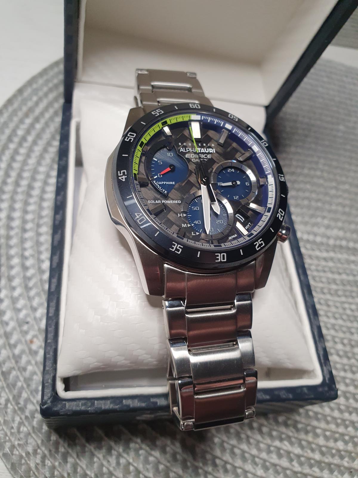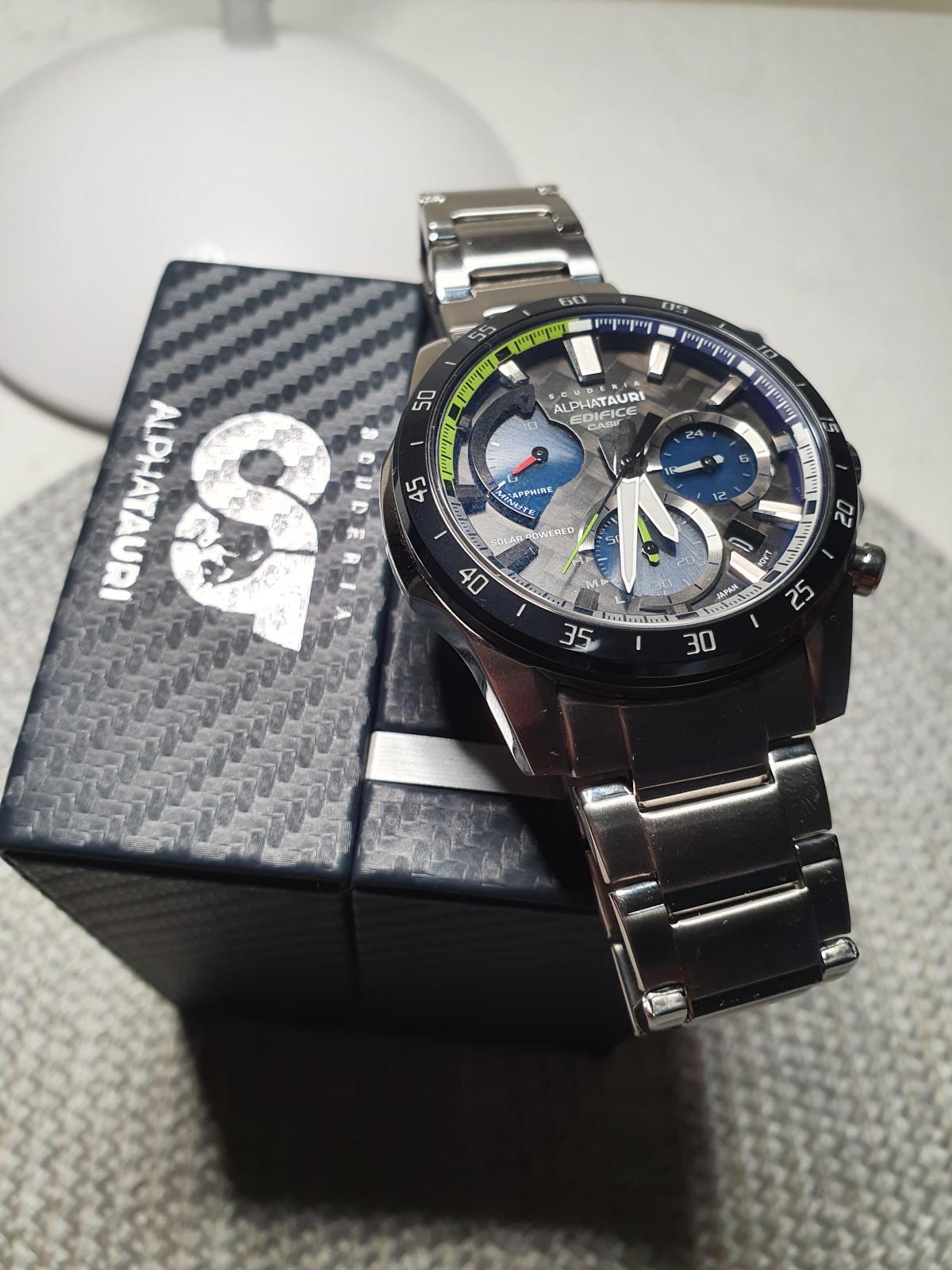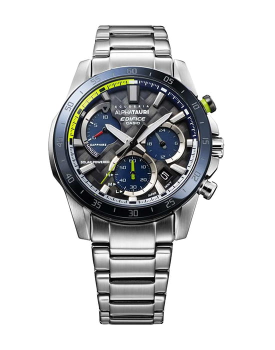 Часы Casio Edifice EFS-S580AT-1AER из лимитированной серии, созданной в коллаборации с итальянской гоночной командой Формулы-1 Scuderia AlphaTauri. Внутренний корпус часов изготовлен из того же углеродного волокна 6K, что используется в аэродинамических крыльях гоночной машины Scuderia AlphaTauri. Элементы циферблата и секундная стрелка окрашены в флуоресцентный желтый цвет, который используется на трассах Формулы-1 для безопасности.