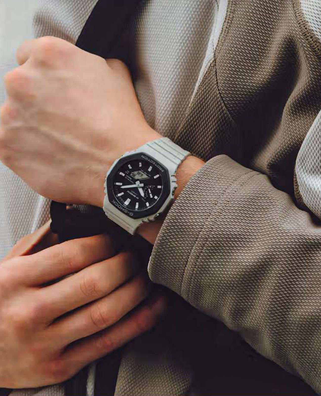 Японские мужские часы-хронографХронографФункция позволяет измерять отрезки времени с особой точностью: часы, минуты, секунды. Верным признаком хронографа является наличие на циферблате 3 дополнительных окошек-счётчиков. Casio G-Shock GA. Супер стильная обновленная расцветка в одном из самых популярных корпусов G-Shock последних лет. Харизматичная модель в матовом корпусе с контрастными стрелками из серии GA-B2100 сохранила внешний облик своих предшественников по серии GA-2100, но получила более технологичный модуль с блютус синхронизацией со смартфоном и Tough SolarTough SolarТехнология основана на подзарядке аккумулятора от источника солнечного света, специальная панель улавливает солнечные лучи и преобразует их в энергию для работы часов. Достаточно пары минут нахождения на солнце для функционирования часов в течении суток.. Минеральное стеклоМинеральное стеклоМинеральное стекло представляет собой искусственно выращенный минерал кварца. Такое стекло отличается особой устойчивостью к повреждениям и царапинам. Уступает по некоторым качествам сапфировому стеклу. устойчивое к появлению царапин, обладающее высокой прозрачностью. Ударопрочный корпусУдаропрочный корпусМеханизм заключён в корпус, выполненный из современных материалов, устойчивых к ударам, механическим повреждениям и падению с высоты: инновационный пластик, карбон, нержавеющая сталь, титан. Carbon Core GuardCarbon Core Guard Новейшая структура корпуса, разработанная Casio. Полиуретановая пластина дополнительно усилена карбоновыми вставками, что придаёт специальную защиту от механических повреждений. Карбон отличается лёгкостью и прочностью.. Светодиодная подсветкаСветодиодная подсветкаСветодиодная или LED-подсветка обеспечивает появление яркого холодного свечения за счёт LED-элементов - маленьких лампочек. Они потребляют минимальное количество энергии, чаще всего можно встретить 1 светодиод, в нижней части циферблата. освещает весь циферблат, после отпускания кнопки свечение продолжается еще некоторое время. Настраиваемое послесвечение 1,5 или 3сек. Мировое время Мировое время Полезное часовое усложнение, отображающее время в основных городах и известных областях по всему миру, оно связано с часовыми поясами, удобно для путешественников и бизнесменов. 38 городов (38 часовых поясов), всемирное координированное время UTCUTCВсемирное кординационное время, не имеющее привязки к географическому положению Гринвича, основывается на атомном отсчёте времени. Регулировка времени осуществляется более точно, чем устаревшее GMT.