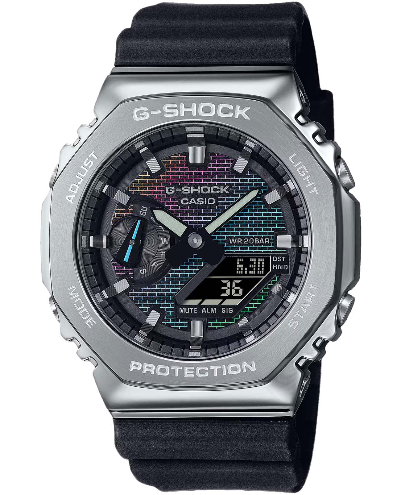 Японские ударопрочныеУдаропрочный корпусМеханизм заключён в корпус, выполненный из современных материалов, устойчивых к ударам, механическим повреждениям и падению с высоты: инновационный пластик, карбон, нержавеющая сталь, титан. мужские часы-хронографХронографФункция позволяет измерять отрезки времени с особой точностью: часы, минуты, секунды. Верным признаком хронографа является наличие на циферблате 3 дополнительных окошек-счётчиков. Casio G-Shock GM-2100RW-1A в стальном корпусе. Минеральное стеклоМинеральное стеклоМинеральное стекло представляет собой искусственно выращенный минерал кварца. Такое стекло отличается особой устойчивостью к повреждениям и царапинам. Уступает по некоторым качествам сапфировому стеклу. устойчивое к появлению царапин, обладающее высокой прозрачностью. Сверхмощная двойная подсветка. При нажатии на кнопку подсветки циферблат часов освещает светодиод, а также отдельно подсвечивается цифровой дисплей. На стрелки часов нанесено NeobriteПодсветка NeobriteИспользование светонакопительных составов на основе сульфида цинка или алюмината стронция, яркий свет можно наблюдать на протяжении 6-10 часов после «зарядки» часов около источника света.-покрытие. Полный автокалендарь (до 2099 года). Включение/выключение звукового сигнала нажатия кнопки. 12/24-часовой формат времени. Мировое время Мировое время Полезное часовое усложнение, отображающее время в основных городах и известных областях по всему миру, оно связано с часовыми поясами, удобно для путешественников и бизнесменов. 31 часовой пояс (48 городов + всемирное координированное время), переход на летнее время вкл./выкл. СекундомерСекундомерСекундоме́р — прибор, способный измерять интервалы времени с точностью до долей секунды.. ТаймерТаймерОтсчитывает секунды в обратном направлении в заданном интервале времени.. 5 ежедневных будильников. Почасовой сигнал времени. Класс водозащиты: 200 метров, позволит плавать, нырять и заниматься другими водными видами спорта. Пластиковый ремешок на стандартной застежке.