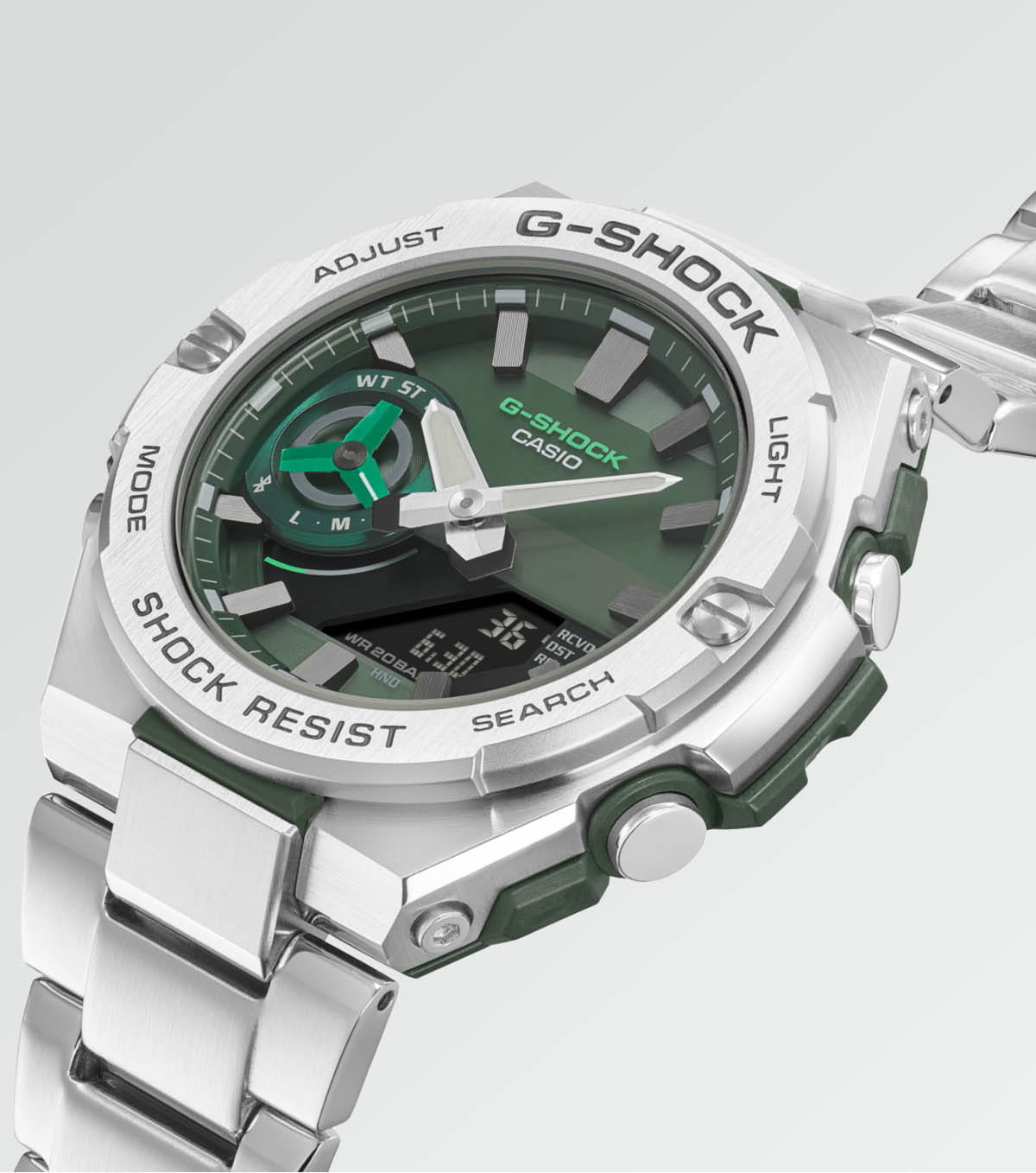 Японские мужские часы-хронографХронографФункция позволяет измерять отрезки времени с особой точностью: часы, минуты, секунды. Верным признаком хронографа является наличие на циферблате 3 дополнительных окошек-счётчиков. с минеральным стекломМинеральное стеклоМинеральное стекло представляет собой искусственно выращенный минерал кварца. Такое стекло отличается особой устойчивостью к повреждениям и царапинам. Уступает по некоторым качествам сапфировому стеклу. Casio G-Shock GST-B500AD-3A, кварцевый механизм с высокой точностью. Линейка GST-B500 объединяет в себе все самое необходимое, что нужно современным мужчинам. Питание от солнечной энергии Tough SolarTough SolarТехнология основана на подзарядке аккумулятора от источника солнечного света, специальная панель улавливает солнечные лучи и преобразует их в энергию для работы часов. Достаточно пары минут нахождения на солнце для функционирования часов в течении суток. солнечные батарейки большой мощности, индикатор заряда батареи. Функция автоматического сохранения энергии. Время работы аккумулятора без подзарядки приблизительно 7 месяцев, при включенной функции сохранения энергии приблизительно 18 месяцев. Механизм часов помещен в корпус из прочного материала, который надежно защищает от внешних воздействий, от ударов и вибрации. Carbon Core GuardCarbon Core Guard Новейшая структура корпуса, разработанная Casio. Полиуретановая пластина дополнительно усилена карбоновыми вставками, что придаёт специальную защиту от механических повреждений. Карбон отличается лёгкостью и прочностью. объединяет корпус и заднюю крышку в единый карбоновый моноблок. Ударопрочный корпусУдаропрочный корпусМеханизм заключён в корпус, выполненный из современных материалов, устойчивых к ударам, механическим повреждениям и падению с высоты: инновационный пластик, карбон, нержавеющая сталь, титан. из стали и полимерного материала защищает механизм от ударов и вибрации. Двойная светодиодная белая подсветка Super Illuminator с функцией Afterglow, одновременно подсвечивается аналоговый циферблат и цифровой дисплей. Светонакопительное покрытие NeobriteПодсветка NeobriteИспользование светонакопительных составов на основе сульфида цинка или алюмината стронция, яркий свет можно наблюдать на протяжении 6-10 часов после «зарядки» часов около источника света. обеспечивает длительное послесвечение в темноте даже после кратковременного нахождения на свету. Сплит-хронографСплит-хронографИспользуется для измерения продолжительности нескольких временных отрезков, начинающихся одновременно, а заканчивающихся в разное время.. ТаймерТаймерОтсчитывает секунды в обратном направлении в заданном интервале времени. обратного отсчета от 1 секунды до 1 часа. Мировое времяМировое время Полезное часовое усложнение, отображающее время в основных городах и известных областях по всему миру, оно связано с часовыми поясами, удобно для путешественников и бизнесменов. – 38 часовых поясов, всемирное координированное время (UTCUTCВсемирное кординационное время, не имеющее привязки к географическому положению Гринвича, основывается на атомном отсчёте времени. Регулировка времени осуществляется более точно, чем устаревшее GMT.