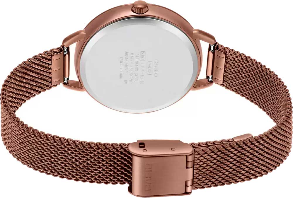Японские женские часы Casio Collection LTP-E415MR-7C из коллекции LTP с минеральным стекломМинеральное стеклоМинеральное стекло представляет собой искусственно выращенный минерал кварца. Такое стекло отличается особой устойчивостью к повреждениям и царапинам. Уступает по некоторым качествам сапфировому стеклу. изящно смотрятся на запястье, они привлекают классическим исполнением и правильной геометрией. Минималистичная модель станет отличным решением для любого случая: на работу, переговоры с деловыми партнёрами, прогулку с друзьями или праздничный вечер. Отсутствуют лишние детали, что позволяет часам быть актуальными на долгие годы. Корпус выполнен из нержавеющей стали с IP-покрытиемIP-покрытиеМетод ионного напыления. Демонстрирует повышенную устойчивость к истиранию, окислению и химическим веществам. Под воздействием высокого давления и температуры около 1500°C молекулы металла надёжно соединяются с частицами корпуса часов.. Браслет миланского плетения с раскладной застёжкойРаскладная застёжкаТакой тип застёжки используется только на браслетах из металла. Она никогда не раскрывается полностью, происходит разделение на 2 и более частей. Раскладывающая застёжка снизит вероятность потери часов к минимуму.. Модель комплектуется надёжным механизмом, точность хода которого составляет +/- 20 сек/мес.
