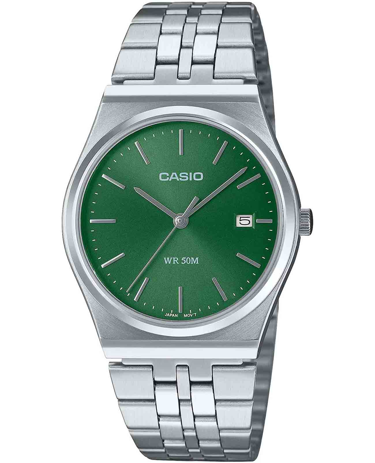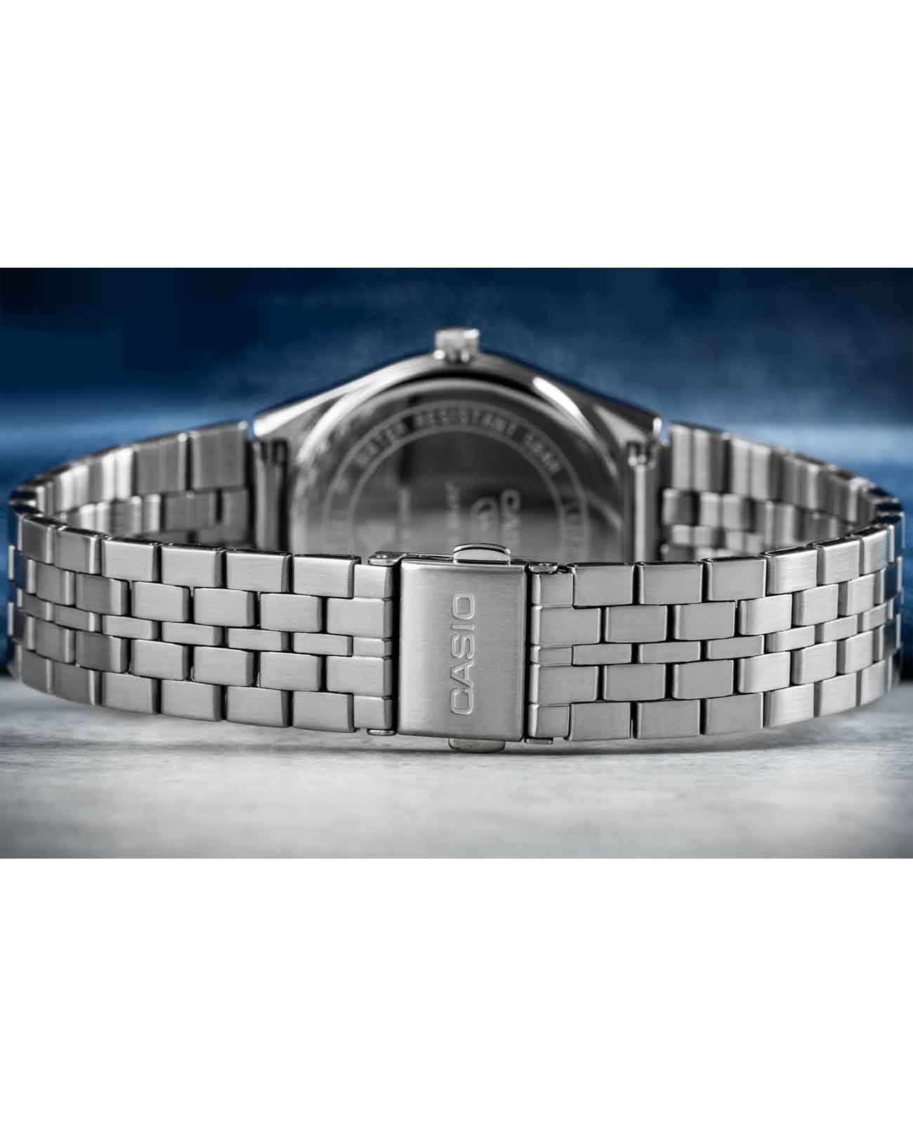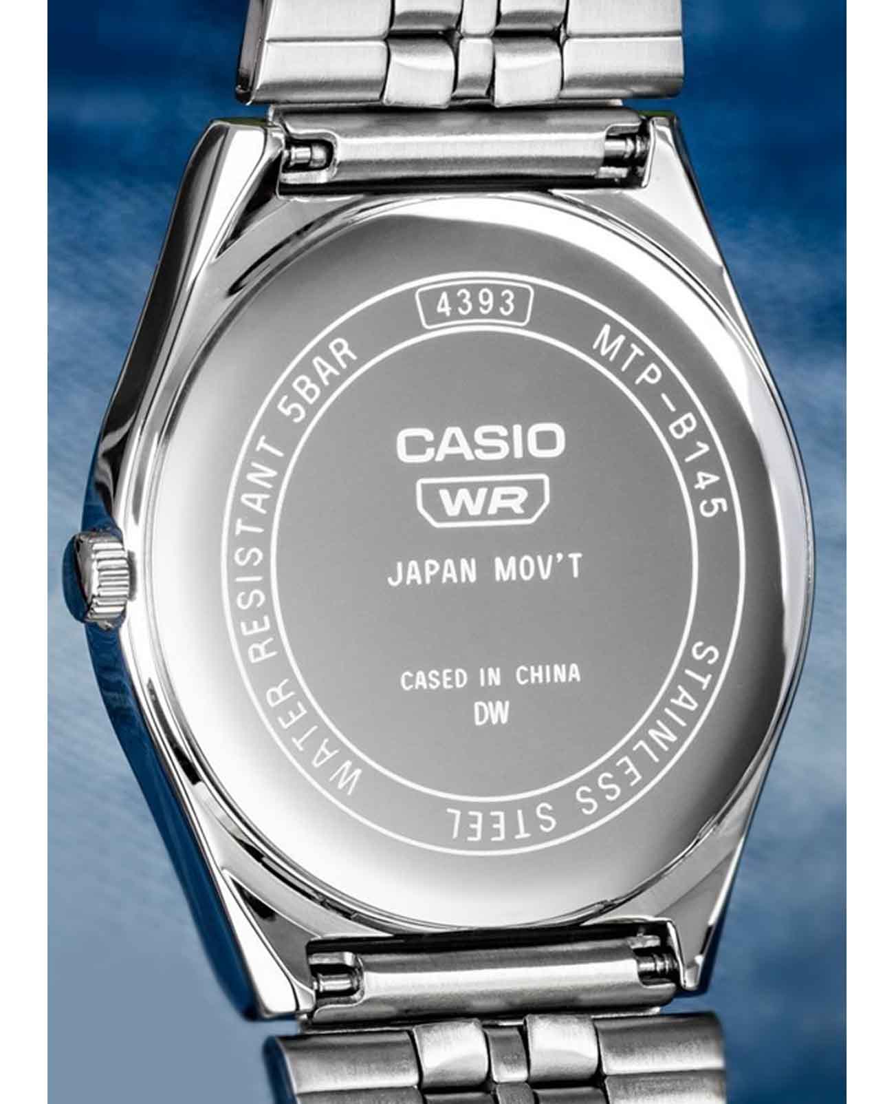 Японские мужские часы с минеральным стекломМинеральное стеклоМинеральное стекло представляет собой искусственно выращенный минерал кварца. Такое стекло отличается особой устойчивостью к повреждениям и царапинам. Уступает по некоторым качествам сапфировому стеклу. Casio Collection MTP-B145D-3AVDF (MTP-B145D-3A), кварцевый механизм с высокой точностью. Корпус часов изготовлен из стали. Циферблат с метками в виде штрихов выполнен по технологии Sunray (солнечные лучи). Окошко даты находится в положении 3 часа. Батарейка рассчитана на 3 года. Класс водозащиты: 50 метров, позволит защитить корпус от случайных брызг или капель дождя. Стальной браслет на раскладной застёжкеРаскладная застёжкаТакой тип застёжки используется только на браслетах из металла. Она никогда не раскрывается полностью, происходит разделение на 2 и более частей. Раскладывающая застёжка снизит вероятность потери часов к минимуму..