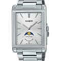 Японские мужские кварцевые часы с минеральным стекломМинеральное стеклоМинеральное стекло представляет собой искусственно выращенный минерал кварца. Такое стекло отличается особой устойчивостью к повреждениям и царапинам. Уступает по некоторым качествам сапфировому стеклу. Casio Collection MTP-M105D-7A, кварцевый механизм с высокой точностью. Корпус и барслет часов изготовлены из нержавеющей стали. Циферблат с метками в виде штрихов выполнен по технологии Sunray (солнечные лучи). Указатель фаз Луны в положении 6 часов. Батарейка рассчитана на 3 года. Класс водозащиты: 50 метров, позволит защитить корпус от случайных брызг или капель дождя. Стальной браслет на раскладной застёжкеРаскладная застёжкаТакой тип застёжки используется только на браслетах из металла. Она никогда не раскрывается полностью, происходит разделение на 2 и более частей. Раскладывающая застёжка снизит вероятность потери часов к минимуму..