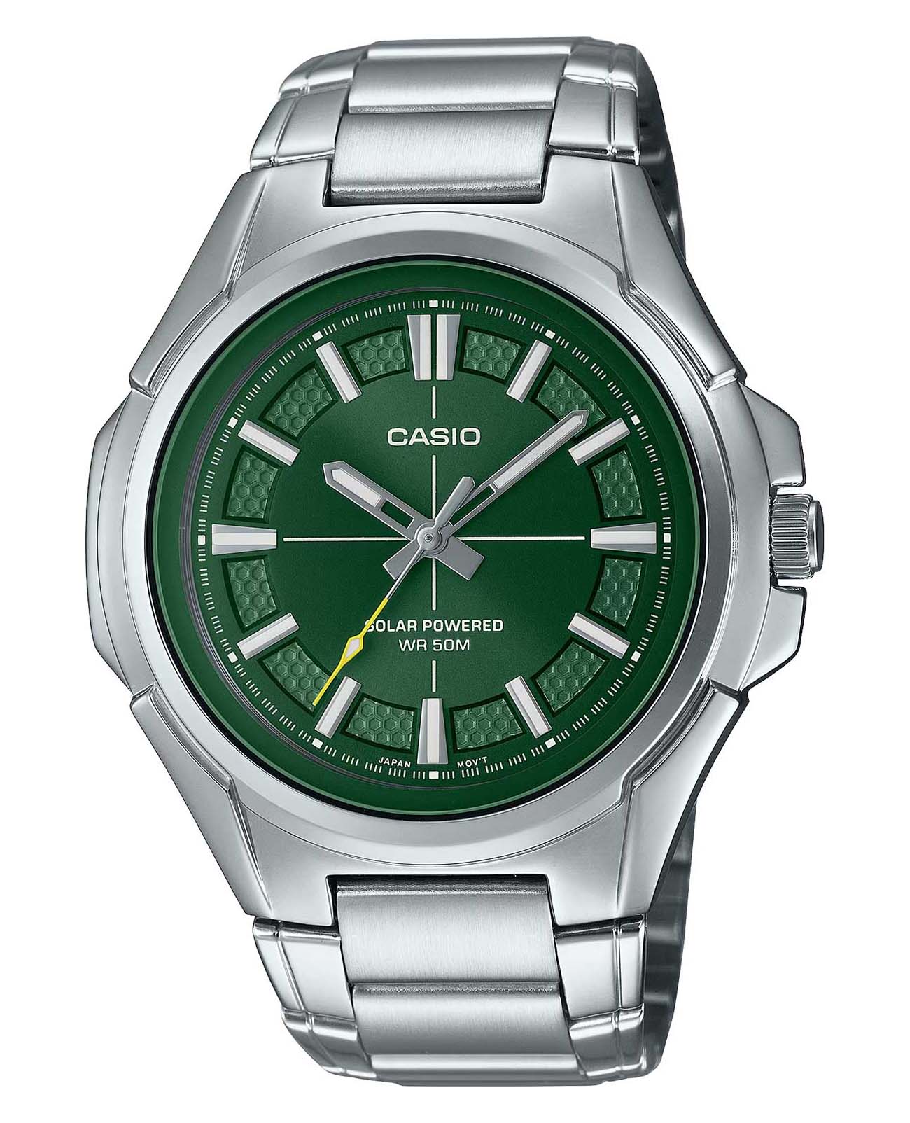 Японские мужские кварцевые часы с минеральным стекломМинеральное стеклоМинеральное стекло представляет собой искусственно выращенный минерал кварца. Такое стекло отличается особой устойчивостью к повреждениям и царапинам. Уступает по некоторым качествам сапфировому стеклу. Casio Collection MTP-RS100D-3A, кварцевый механизм с высокой точностью. Корпус часов изготовлен из нержавеющей стали. Питание от солнечной энергии. Время работы - 4 месяца. Циферблат с метками в виде штрихов выполнен по технологии Sunray (солнечные лучи). Циферблат с метками в виде штрихов. Стрелки и метки с люминесцентным покрытиемЛюминесцентное покрытиеПозволяет считывать показания времени в темноте. Производители наносят на стрелки, часовые индексы, безель или поверхность циферблата светонакопительный состав, дающий холодное свечение.. Заводная головка с защитой. Класс водозащиты: 50 метров, позволит защитить корпус от случайных брызг или капель дождя. Стальной браслет на раскладной застёжкеРаскладная застёжкаТакой тип застёжки используется только на браслетах из металла. Она никогда не раскрывается полностью, происходит разделение на 2 и более частей. Раскладывающая застёжка снизит вероятность потери часов к минимуму..