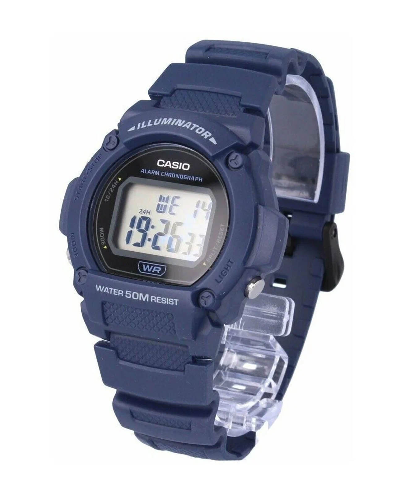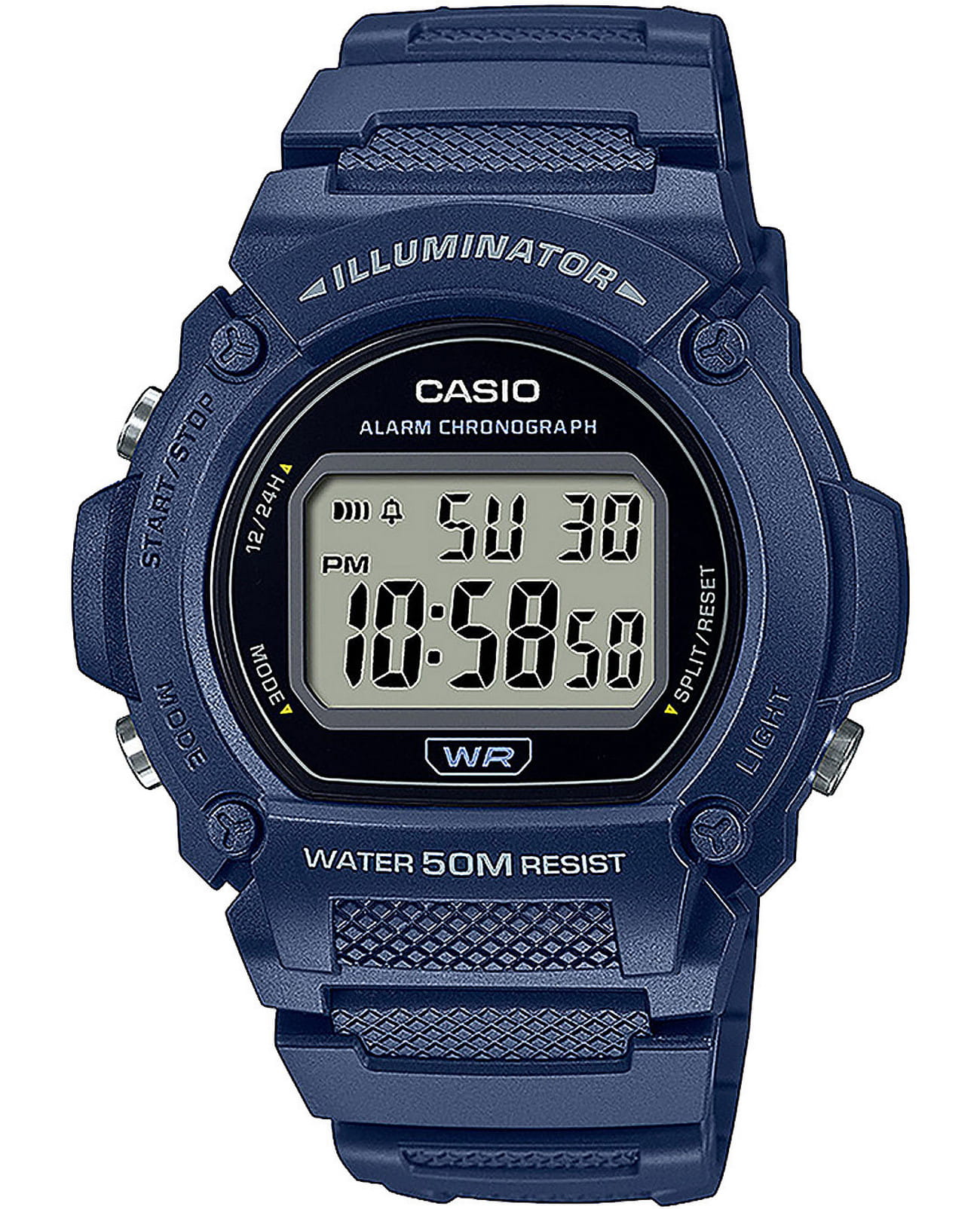 Спортивные японские мужские часы-хронографХронографФункция позволяет измерять отрезки времени с особой точностью: часы, минуты, секунды. Верным признаком хронографа является наличие на циферблате 3 дополнительных окошек-счётчиков. Casio Collection W-219H-2A, кварцевый механизм с высокой точностью, органическое стекло. Корпус часов изготовлен из плачтика. Светодиодная подсветкаСветодиодная подсветкаСветодиодная или LED-подсветка обеспечивает появление яркого холодного свечения за счёт LED-элементов - маленьких лампочек. Они потребляют минимальное количество энергии, чаще всего можно встретить 1 светодиод, в нижней части циферблата. освещает весь циферблат. Цвет подсветки: оранжевый. 12-ти и 24-х часовой формат времени. СекундомерСекундомерСекундоме́р — прибор, способный измерять интервалы времени с точностью до долей секунды. с точностью показаний 1/100с и временем измерения 1ч. Сплит-хронографСплит-хронографИспользуется для измерения продолжительности нескольких временных отрезков, начинающихся одновременно, а заканчивающихся в разное время.. Батарейка рассчитана на 7 лет.  Класс водозащиты: 50 метров, позволит защитить корпус от случайных брызг или капель дождя. Ремешок из полимерного материала на стандартной застежке.