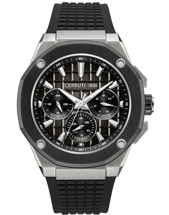 Cerruti 1881 CIWGQ0073401 — стильные мужские часы с выразительным индустриальным дизайном, в которых сочетаются спортивная энергия и итальянская элегантность. Корпус из нержавеющей стали с массивным безелемБезельВнешний ободок, закрепляющий стекло. В спортивных часах так называется поворотное кольцо с делениями на циферблате, выполняет роль таймера – замеряет отрезки времени на шкале. Неподвижный безель – элемент декора. Однонаправленно вращающийся безель на дайверских часах позволяет фиксировать моменты погружения и выныривания на поверхность. с PVD-покрытиемPVDУльтратонкое покрытие наносится в технике вакуумного напыления, сочетает в себе нитрид титана особой прочности со слоем золота или оксида хрома. Несёт в себе декоративную или защитную функцию. и декоративными винтами придаёт модели мощный и мужественный облик. Глубокий циферблат с тремя счётчиками хронографаХронографФункция позволяет измерять отрезки времени с особой точностью: часы, минуты, секунды. Верным признаком хронографа является наличие на циферблате 3 дополнительных окошек-счётчиков. подчёркивает технический характер часов, а контрастные стрелки и метки с люминесцентным покрытиемЛюминесцентное покрытиеПозволяет считывать показания времени в темноте. Производители наносят на стрелки, часовые индексы, безель или поверхность циферблата светонакопительный состав, дающий холодное свечение. обеспечивают отличную читаемость при любом освещении. Прочное минеральное стеклоМинеральное стеклоМинеральное стекло представляет собой искусственно выращенный минерал кварца. Такое стекло отличается особой устойчивостью к повреждениям и царапинам. Уступает по некоторым качествам сапфировому стеклу. защищает циферблат от царапин, а эластичный силиконовый ремешок гарантирует комфорт при повседневном ношении. Cerruti 1881 — гармоничное сочетание функциональности, надёжности и узнаваемого итальянского стиля, идеально подходящее для активных и уверенных мужчин.