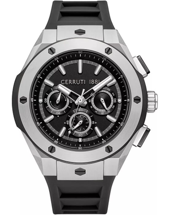 Cerruti 1881 CIWGQ0085601 — стильные мужские часы с выразительным индустриальным дизайном, в которых сочетаются спортивная энергия и итальянская элегантность. Корпус из нержавеющей стали с массивным безелемБезельВнешний ободок, закрепляющий стекло. В спортивных часах так называется поворотное кольцо с делениями на циферблате, выполняет роль таймера – замеряет отрезки времени на шкале. Неподвижный безель – элемент декора. Однонаправленно вращающийся безель на дайверских часах позволяет фиксировать моменты погружения и выныривания на поверхность. с частичным PVD-покрытиемPVDУльтратонкое покрытие наносится в технике вакуумного напыления, сочетает в себе нитрид титана особой прочности со слоем золота или оксида хрома. Несёт в себе декоративную или защитную функцию. и декоративными винтами придаёт модели мощный и мужественный облик. Глубокий циферблат с тремя счётчиками хронографаХронографФункция позволяет измерять отрезки времени с особой точностью: часы, минуты, секунды. Верным признаком хронографа является наличие на циферблате 3 дополнительных окошек-счётчиков. подчёркивает технический характер часов, а контрастные стрелки и метки с люминесцентным покрытиемЛюминесцентное покрытиеПозволяет считывать показания времени в темноте. Производители наносят на стрелки, часовые индексы, безель или поверхность циферблата светонакопительный состав, дающий холодное свечение. обеспечивают отличную читаемость при любом освещении. Прочное минеральное стеклоМинеральное стеклоМинеральное стекло представляет собой искусственно выращенный минерал кварца. Такое стекло отличается особой устойчивостью к повреждениям и царапинам. Уступает по некоторым качествам сапфировому стеклу. защищает циферблат от царапин, а эластичный силиконовый ремешок гарантирует комфорт при повседневном ношении. Cerruti 1881 — гармоничное сочетание функциональности, надёжности и узнаваемого итальянского стиля, идеально подходящее для активных и уверенных мужчин.
