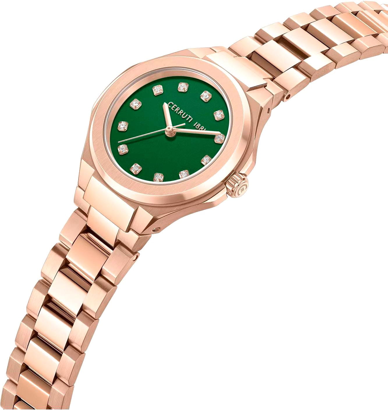 Женские кварцевые часы Cerruti 1881 Lucardo CIWLG0086401 — изысканный французский аксессуар с итальянским шармом. Корпус из нержавеющей стали 316L с PVD-покрытиемPVDУльтратонкое покрытие наносится в технике вакуумного напыления, сочетает в себе нитрид титана особой прочности со слоем золота или оксида хрома. Несёт в себе декоративную или защитную функцию. цвета розового золота, диаметром 32,5 мм. Циферблат — зелёный с точечными метками, инкрустированными кристаллами. Стекло — минеральноеМинеральное стеклоМинеральное стекло представляет собой искусственно выращенный минерал кварца. Такое стекло отличается особой устойчивостью к повреждениям и царапинам. Уступает по некоторым качествам сапфировому стеклу. с сапфировым покрытием. Браслет — стальной с PVD-покрытиемPVDУльтратонкое покрытие наносится в технике вакуумного напыления, сочетает в себе нитрид титана особой прочности со слоем золота или оксида хрома. Несёт в себе декоративную или защитную функцию. на застёжке «бабочка» с кнопкамиЗастёжка "бабочка"Такой вид застёжки дополняется предохранителями, помогающими избежать случайного раскрытия браслета. Обладают изящным исполнением. . Водонепроницаемость 50 м. Идеальный выбор для тех, кто ценит французский дизайн и утончённую элегантность.