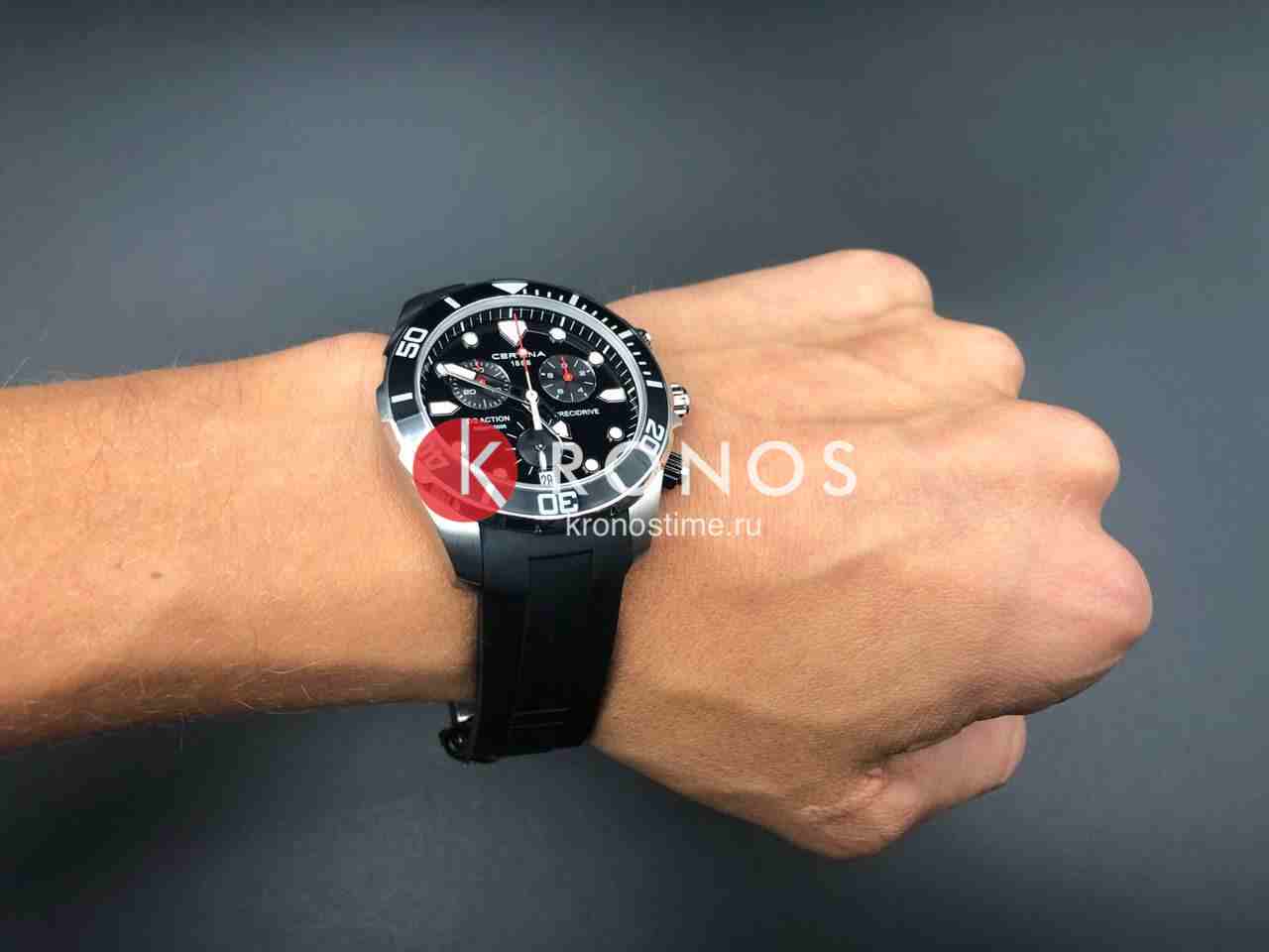 Наручные часы отличаются привлекательным дизайном, чёрный циферблат имеет крупную индикацию времени, расставлены акценты красного цвета. Модель комплектуется кварцевым механизмом ETA Precidrive™Precidrive™Инновационный кварцевый механизм Certina. Часы, оснащённые этим швейцарским калибром, приравниваются к точности к сертифицированным хронометрам, точность хода составляет +/-10 секунд в год., отличающимся отменной точностью хода. Вращающийся безельБезельВнешний ободок, закрепляющий стекло. В спортивных часах так называется поворотное кольцо с делениями на циферблате, выполняет роль таймера – замеряет отрезки времени на шкале. Неподвижный безель – элемент декора. Однонаправленно вращающийся безель на дайверских часах позволяет фиксировать моменты погружения и выныривания на поверхность. имеет чёрное PVD-покрытиеPVDУльтратонкое покрытие наносится в технике вакуумного напыления, сочетает в себе нитрид титана особой прочности со слоем золота или оксида хрома. Несёт в себе декоративную или защитную функцию., защищающее от царапин. Сапфировое стекло с антибликовой обработкой. Силиконовый ремешок. Индикатор EOLEOLПредставляет собой систему, уведомляющую владельца часов о необходимости замены элемента питания. За 2 недели до полного разряда батарейки секундная стрелка перестаёт ходить чётко и начинает перепрыгивать на 3-4 деления.. Секундомер, хронографХронографФункция позволяет измерять отрезки времени с особой точностью: часы, минуты, секунды. Верным признаком хронографа является наличие на циферблате 3 дополнительных окошек-счётчиков., окошко даты. Диаметр корпуса: 43 мм.
