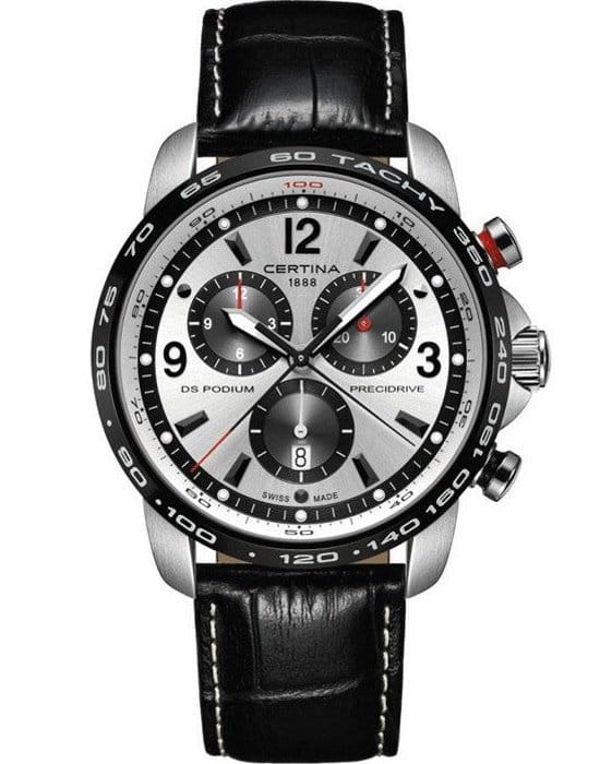ХронографХронографФункция позволяет измерять отрезки времени с особой точностью: часы, минуты, секунды. Верным признаком хронографа является наличие на циферблате 3 дополнительных окошек-счётчиков. представлен в спортивном стиле. Харизматичная модель представляет собой отличный вариант для повседневного или делового образа, аксессуар поможет придать завершенности. Швейцарский инновационный кварцевый калибр ETA 251.264 Precidrive™Precidrive™Инновационный кварцевый механизм Certina. Часы, оснащённые этим швейцарским калибром, приравниваются к точности к сертифицированным хронометрам, точность хода составляет +/-10 секунд в год.. Антибликовое покрытие сапфирового стекла. Концепция DS ConceptDS ConceptDouble Security Concept, обозначает двойную надёжность и безупречную точность часов Certina. Двойная система защиты подразумевает обеспечение максимальной устойчивости к ударам и высоких показателей водонепроницаемости.. Водонепроницаемость до 20 бар. Ударопрочный корпусУдаропрочный корпусМеханизм заключён в корпус, выполненный из современных материалов, устойчивых к ударам, механическим повреждениям и падению с высоты: инновационный пластик, карбон, нержавеющая сталь, титан. из долговечной стали 316L с чёрным PVD-финишемPVDУльтратонкое покрытие наносится в технике вакуумного напыления, сочетает в себе нитрид титана особой прочности со слоем золота или оксида хрома. Несёт в себе декоративную или защитную функцию.. Завинчивающаяся задняя крышка. Защищённая заводная головка. Ремешок из натуральной кожи с . Показания времени с точностью до 1/100 секунды, отображение текущего числа, индикатор EOLEOLПредставляет собой систему, уведомляющую владельца часов о необходимости замены элемента питания. За 2 недели до полного разряда батарейки секундная стрелка перестаёт ходить чётко и начинает перепрыгивать на 3-4 деления., шкала тахиметраТахиметрРазмеченная шкала, располагается на ободке или безеле часов. Тахиметр позволяет рассчитать скорость на определённом участке пути, расстояние измеряется в километрах или милях.. Диаметр корпуса: 44 мм.