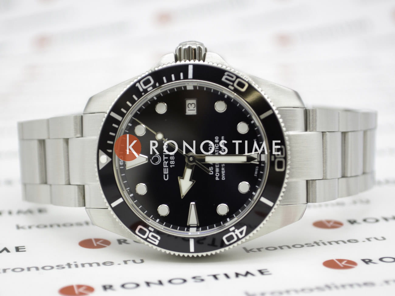 Брендовый хронографХронографФункция позволяет измерять отрезки времени с особой точностью: часы, минуты, секунды. Верным признаком хронографа является наличие на циферблате 3 дополнительных окошек-счётчиков. имеет привлекательную чёрно-серебристую расцветку, благодаря чему часы можно носить даже со строгими деловыми костюмами. Модель комплектуется кварцевым механизмом ETA Precidrive™Precidrive™Инновационный кварцевый механизм Certina. Часы, оснащённые этим швейцарским калибром, приравниваются к точности к сертифицированным хронометрам, точность хода составляет +/-10 секунд в год. с высокой точностью хода. Циферблат защищает сапфировое стекло, имеющее антибликовое покрытие. Яркая люминесцентная подсветкаЛюминесцентное покрытиеПозволяет считывать показания времени в темноте. Производители наносят на стрелки, часовые индексы, безель или поверхность циферблата светонакопительный состав, дающий холодное свечение.. БезельБезельВнешний ободок, закрепляющий стекло. В спортивных часах так называется поворотное кольцо с делениями на циферблате, выполняет роль таймера – замеряет отрезки времени на шкале. Неподвижный безель – элемент декора. Однонаправленно вращающийся безель на дайверских часах позволяет фиксировать моменты погружения и выныривания на поверхность. с цветным PVD-покрытиемPVDУльтратонкое покрытие наносится в технике вакуумного напыления, сочетает в себе нитрид титана особой прочности со слоем золота или оксида хрома. Несёт в себе декоративную или защитную функцию.. Водостойкость 300 метров. Секундомер, отображение числа. Индикатор EOLEOLПредставляет собой систему, уведомляющую владельца часов о необходимости замены элемента питания. За 2 недели до полного разряда батарейки секундная стрелка перестаёт ходить чётко и начинает перепрыгивать на 3-4 деления.. Диаметр корпуса: 43 мм.