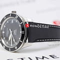 Чёрный циферблат дополнен люминесцентными стрелками и метками с покрытием Super-LumiNova®, что гарантирует видимость даже в условиях низкой освещённости. Однонаправленный вращающийся алюминиевый безель с минутной разметкой обеспечивает точный контроль времени погружения. Окошко даты расположено на отметке «3 часа», добавляя удобства.