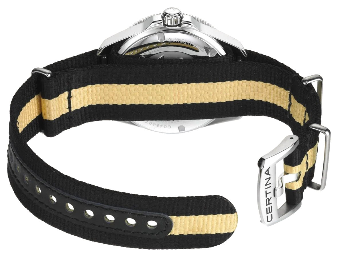 Мужские механические часы Certina DS-Action C0484071805101 — это надёжный аксессуар, созданный для тех, кто ценит сочетание швейцарского качества, функциональности и стиля. Модель входит в коллекцию Aqua, что подчёркивает её предназначение для водных активностей. Корпус диаметром 40,5 мм выполнен из нержавеющей стали с чёрной керамической рамкой, которая не только придаёт модели спортивный вид, но и защищает механизм от царапин. Циферблат чёрного цвета дополнен люминесцентными стрелками и индексами, обеспечивающими отличную читаемость даже в условиях слабого освещения. Защиту механизма обеспечивает сапфировое стеклоСапфировое стеклоПрочный и надёжный материал из кристалла сапфира синтетического происхождения, характеризующийся особой твёрдостью и устойчивостью к царапинам и повреждениям. с антибликовым покрытиемАнтибликовое покрытиеСлой оксида металла в 0,13-0,3 микрон, благодаря которому стекло часов не бликует и не отражает свет. Антибликовое покрытие уменьшает отражение света в 10 раз, обеспечивая отличную читаемость показателей циферблата., устойчивое к повреждениям. Часы оснащены автоматическим механизмом с запасом хода до 80 часов и пружиной баланса Nivachron™, что гарантирует высокую точность и долговечность. Функция отображения времени (часы, минуты, секунды) и даты делает модель удобной для повседневного использования. Водонепроницаемость позволяет использовать часы на глубине до 300 метров — идеально для плавания и ныряния. Ремешок NATO чёрного и золотистого цвета застёгивается на булавку, обеспечивая комфорт и надёжную фиксацию на запястье. Концепция DS, лежащая в основе всех моделей бренда, обеспечивает двойную защиту от ударов и вибраций, а также повышенную устойчивость к внешним воздействиям. Эти часы станут универсальным аксессуаром для тех, кто ценит сочетание стиля, функциональности и надёжности — идеальный выбор для повседневной носки и активного образа жизни.