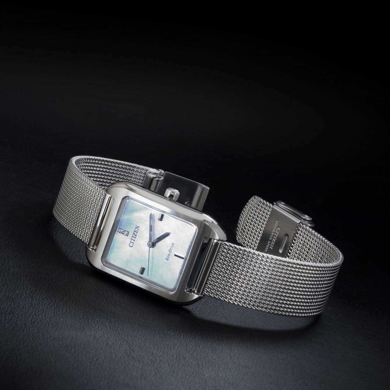 Часы Citizen EM0491-81D созданы для тех, кто ценит элегантность и современные технологии в одном аксессуаре. Корпус выполнен из прочной нержавеющей стали и гармонично сочетается с изысканным стальным браслетом миланского плетения с раскладным замкомРаскладной замокДанный вариант застежки используется только на часах с металлическим браслетом. Отличительная особенность такого крепления в том, что длина браслета становится универсальной и вы можете самостоятельно отрегулировать нужный вам размер – застежка просто двигается по браслету часов., обеспечивающим комфортную посадку на запястье. Особое внимание привлекает перламутровый белый циферблат, украшенный мерцающими кристаллами, которые придают часам особый шарм и изысканность. Метки выполнены в виде аккуратных штрихов, что обеспечивает лёгкое считывание времени. Часы оснащены надёжным кварцевым механизмом Citizen E031 с инновационной системой Eco-Drive, которая позволяет заряжать устройство от любого источника света и не требует замены батарейки. Запас хода составляет до 180 дней, а функция индикации заряда EOLEOLПредставляет собой систему, уведомляющую владельца часов о необходимости замены элемента питания. За 2 недели до полного разряда батарейки секундная стрелка перестаёт ходить чётко и начинает перепрыгивать на 3-4 деления. своевременно напомнит о необходимости подзарядки. Прочное минеральное стеклоМинеральное стеклоМинеральное стекло представляет собой искусственно выращенный минерал кварца. Такое стекло отличается особой устойчивостью к повреждениям и царапинам. Уступает по некоторым качествам сапфировому стеклу. защищает циферблат от царапин и повреждений, а водозащита до 30 метров позволяет не беспокоиться о случайных брызгах воды. Размер корпуса составляет 24 х 32 мм. Лёгкий вес всего 42 грамма, толщина корпуса 7,7 мм и ширина браслета 14 мм делают эту модель удобной для повседневного ношения и подчёркивают стильный образ.