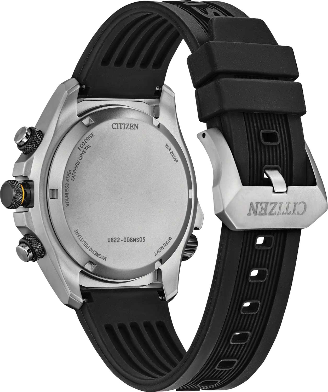 Citizen Promaster JV1007-07E часы-хронографХронографФункция позволяет измерять отрезки времени с особой точностью: часы, минуты, секунды. Верным признаком хронографа является наличие на циферблате 3 дополнительных окошек-счётчиков. с секундомеромСекундомерСекундоме́р — прибор, способный измерять интервалы времени с точностью до долей секунды. спортивного дизайна с высоким уровнем водозащиты. Корпус из нержавеющей стали диаметром 43,9 мм идеально сбалансирован. Сапфировое стеклоСапфировое стеклоПрочный и надёжный материал из кристалла сапфира синтетического происхождения, характеризующийся особой твёрдостью и устойчивостью к царапинам и повреждениям. с антибликовым покрытием обеспечивает отличную защиту циферблата от царапин. Часы работают на основе кварцевого механизма, питание от солнечной энергии, запас энергии на 360 дней. Время работы при полной зарядке и включенной функции сохранения энергии до 3 лет. Полиуретановый ремешок на стандартной застежке идеально дополняют дизайн часов, обеспечивая комфортное ношение. Стрелки и метки на циферблате имеют люминесцентное покрытиеЛюминесцентное покрытиеПозволяет считывать показания времени в темноте. Производители наносят на стрелки, часовые индексы, безель или поверхность циферблата светонакопительный состав, дающий холодное свечение. позволяющее легко определять время даже в темноте. LCD дисплей с светодиодной подсветкойСветодиодная подсветкаСветодиодная или LED-подсветка обеспечивает появление яркого холодного свечения за счёт LED-элементов - маленьких лампочек. Они потребляют минимальное количество энергии, чаще всего можно встретить 1 светодиод, в нижней части циферблата.. Вращающийся внутренний безельБезельВнешний ободок, закрепляющий стекло. В спортивных часах так называется поворотное кольцо с делениями на циферблате, выполняет роль таймера – замеряет отрезки времени на шкале. Неподвижный безель – элемент декора. Однонаправленно вращающийся безель на дайверских часах позволяет фиксировать моменты погружения и выныривания на поверхность. с IP-покрытиемIP-покрытиеМетод ионного напыления. Демонстрирует повышенную устойчивость к истиранию, окислению и химическим веществам. Под воздействием высокого давления и температуры около 1500°C молекулы металла надёжно соединяются с частицами корпуса часов. со шкалой компаса. Функция индикации заряда (EOL) и предотвращения перезарядки. Мировое времяМировое время Полезное часовое усложнение, отображающее время в основных городах и известных областях по всему миру, оно связано с часовыми поясами, удобно для путешественников и бизнесменов. - 43 города (29 часовых поясов), переход на зимнее и летнее время. Сплит-хронографСплит-хронографИспользуется для измерения продолжительности нескольких временных отрезков, начинающихся одновременно, а заканчивающихся в разное время.. ТаймерТаймерОтсчитывает секунды в обратном направлении в заданном интервале времени. обратного отсчета до 100мин. Всемирное координированное время UTCUTCВсемирное кординационное время, не имеющее привязки к географическому положению Гринвича, основывается на атомном отсчёте времени. Регулировка времени осуществляется более точно, чем устаревшее GMT.