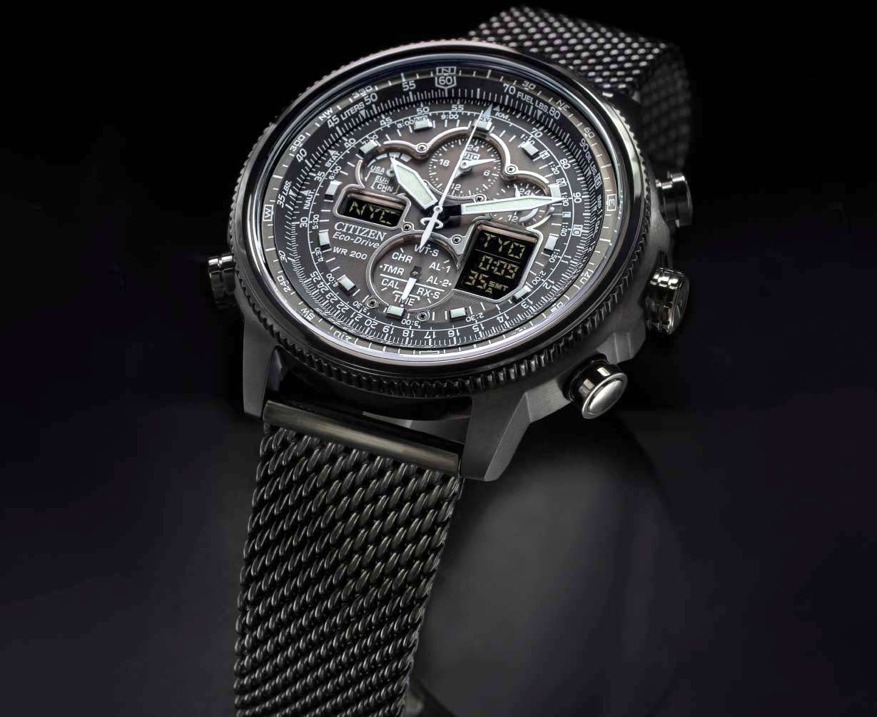 Citizen Promaster JY8037-50E часы-хронографХронографФункция позволяет измерять отрезки времени с особой точностью: часы, минуты, секунды. Верным признаком хронографа является наличие на циферблате 3 дополнительных окошек-счётчиков. с секундомеромСекундомерСекундоме́р — прибор, способный измерять интервалы времени с точностью до долей секунды. спортивного дизайна с высоким уровнем водозащиты. Корпус из нержавеющей стали с IP-покрытиемIP-покрытиеМетод ионного напыления. Демонстрирует повышенную устойчивость к истиранию, окислению и химическим веществам. Под воздействием высокого давления и температуры около 1500°C молекулы металла надёжно соединяются с частицами корпуса часов. диаметром 47,1 мм идеально сбалансирован. Минеральное стеклоМинеральное стеклоМинеральное стекло представляет собой искусственно выращенный минерал кварца. Такое стекло отличается особой устойчивостью к повреждениям и царапинам. Уступает по некоторым качествам сапфировому стеклу. обеспечивает отличную защиту циферблата от царапин. Часы работают на основе кварцевого механизма, питание от солнечной энергии. Стальной браслет миланского плетения на застёжке-бабочке с кнопкамиЗастёжка "бабочка"Такой вид застёжки дополняется предохранителями, помогающими избежать случайного раскрытия браслета. Обладают изящным исполнением. идеально дополняют дизайн часов, обеспечивая комфортное ношение. Стрелки и метки на циферблате имеют люминесцентное покрытиеЛюминесцентное покрытиеПозволяет считывать показания времени в темноте. Производители наносят на стрелки, часовые индексы, безель или поверхность циферблата светонакопительный состав, дающий холодное свечение. позволяющее легко определять время даже в темноте. Поворотный безельБезельВнешний ободок, закрепляющий стекло. В спортивных часах так называется поворотное кольцо с делениями на циферблате, выполняет роль таймера – замеряет отрезки времени на шкале. Неподвижный безель – элемент декора. Однонаправленно вращающийся безель на дайверских часах позволяет фиксировать моменты погружения и выныривания на поверхность.. Автоматический прием сигналов от радиовышек, расположенных в различных точках земного шара, которые передают временные сигналы от определенных атомных часов. Коррекция текущего времени радиосигналом на территории почти всей Европы, США, Японии и Китая. Функция индикации заряда (EOL) и предотвращения перезарядки. Мировое времяМировое время Полезное часовое усложнение, отображающее время в основных городах и известных областях по всему миру, оно связано с часовыми поясами, удобно для путешественников и бизнесменов. - 43 города (29 часовых поясов), переход на зимнее и летнее время. ТаймерТаймерОтсчитывает секунды в обратном направлении в заданном интервале времени. обратного отсчета до 99мин. Секундомер с точностью 1сек и временем измерения 1ч. 12-ти и 24-х часовой формат. Логарифмическая линейка. Часы обладают впечатляющей водонепроницаемостью до 200WR, что делает их идеальными для плавания, ныряния и погружений с аквалангом.