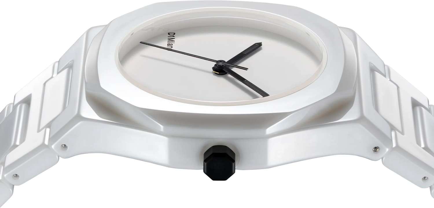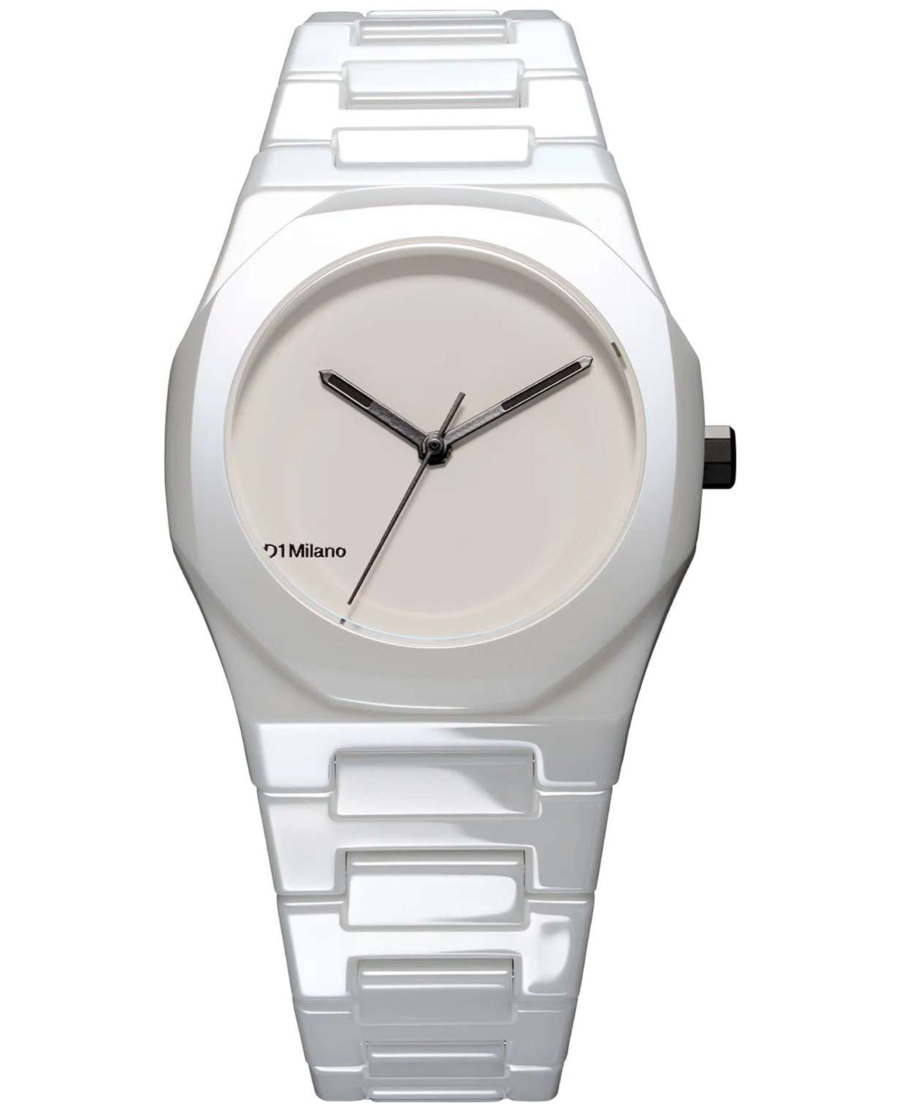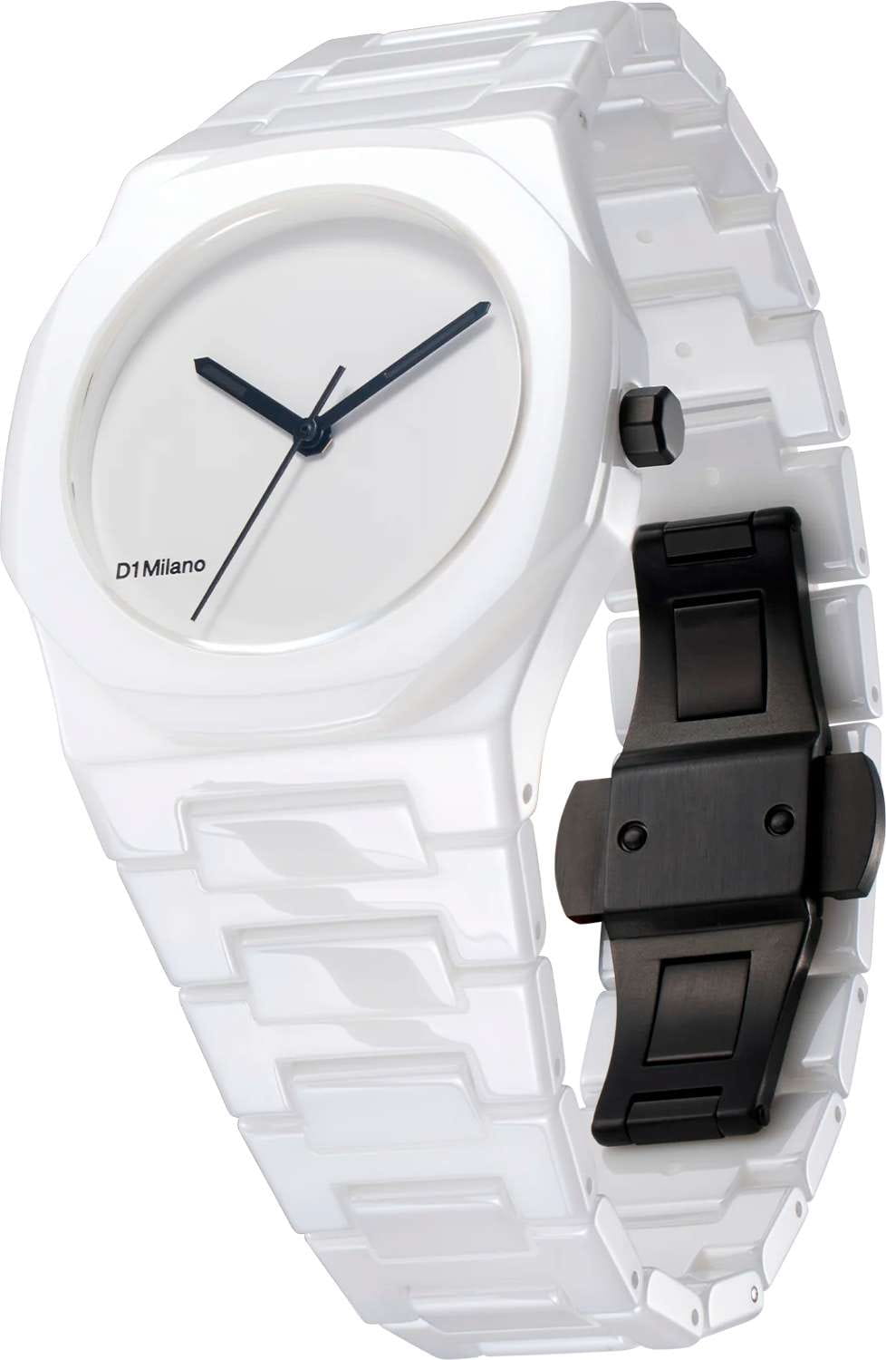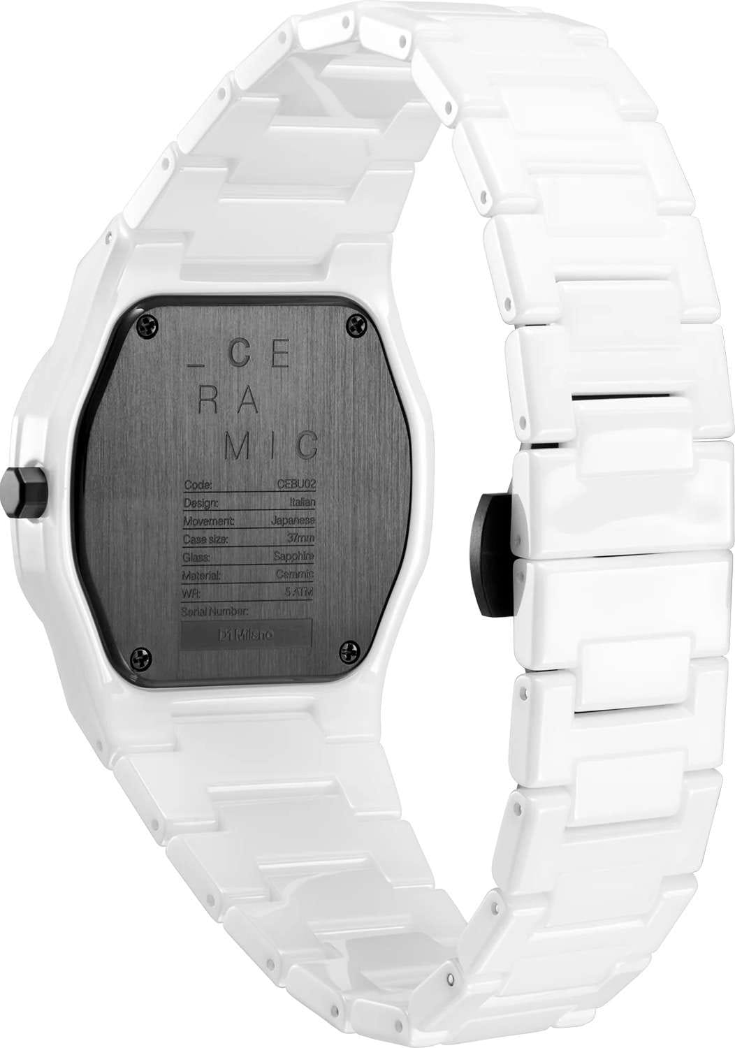 Часы D1 Milano Ceramic CEBU02 Pure White – роскошный аксессуар для современных женщин и мужчин. Кварцевые часы с корпусом из белой керамики. Циферблат лаконичный, без индексов, с надписью бренда. Стрелки из латуни с люминесцентным покрытиемЛюминесцентное покрытиеПозволяет считывать показания времени в темноте. Производители наносят на стрелки, часовые индексы, безель или поверхность циферблата светонакопительный состав, дающий холодное свечение.. Стальная задняя крышка с PVD-покрытиемPVDУльтратонкое покрытие наносится в технике вакуумного напыления, сочетает в себе нитрид титана особой прочности со слоем золота или оксида хрома. Несёт в себе декоративную или защитную функцию. закреплена на 4 винтах, что обеспечивает надежность конструкции. Керамический браслет с застёжкой «бабочка» с кнопкамиЗастёжка "бабочка"Такой вид застёжки дополняется предохранителями, помогающими избежать случайного раскрытия браслета. Обладают изящным исполнением. . Часы сочетают в себе классический дизайн и современные технологии производства.