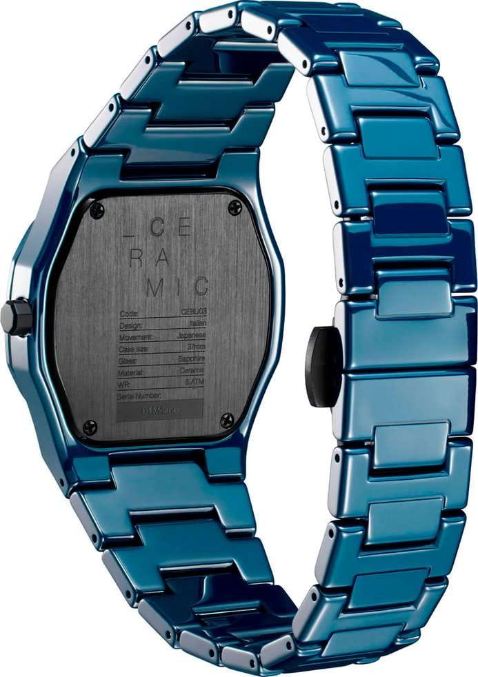 Часы D1 Milano Ceramic CEBU03 Pure Blue – роскошный аксессуар для современных женщин и мужчин. Кварцевые часы с корпусом из синей керамики. Циферблат лаконичный, без индексов, с надписью бренда. Стрелки из латуни с люминесцентным покрытиемЛюминесцентное покрытиеПозволяет считывать показания времени в темноте. Производители наносят на стрелки, часовые индексы, безель или поверхность циферблата светонакопительный состав, дающий холодное свечение.. Стальная задняя крышка с PVD-покрытиемPVDУльтратонкое покрытие наносится в технике вакуумного напыления, сочетает в себе нитрид титана особой прочности со слоем золота или оксида хрома. Несёт в себе декоративную или защитную функцию. закреплена на 4 винтах, что обеспечивает надежность конструкции. Керамический браслет с застёжкой «бабочка» с кнопкамиЗастёжка "бабочка"Такой вид застёжки дополняется предохранителями, помогающими избежать случайного раскрытия браслета. Обладают изящным исполнением. . Часы сочетают в себе классический дизайн и современные технологии производства.