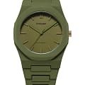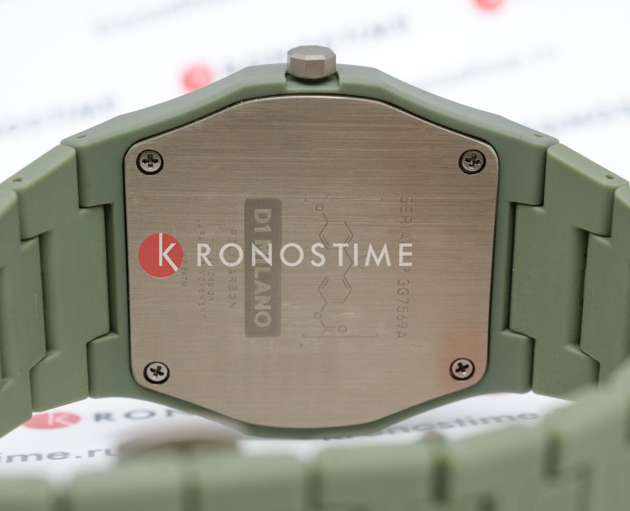 Часы D1 Milano Polycarbon PCBJ22 – молодежные часы в стиле унисекс для повседневных образов. Модель Military Green имеет зеленый корпус из поликарбоната с покрытием Софт-Тач. Циферблат лаконичный с индексами в виде штрихов, защищен минеральным стекломМинеральное стеклоМинеральное стекло представляет собой искусственно выращенный минерал кварца. Такое стекло отличается особой устойчивостью к повреждениям и царапинам. Уступает по некоторым качествам сапфировому стеклу. с антибликовым покрытием. Стальная задняя крышка на 4 винтах. Пластиковый браслет с раскладной застёжкойРаскладная застёжкаТакой тип застёжки используется только на браслетах из металла. Она никогда не раскрывается полностью, происходит разделение на 2 и более частей. Раскладывающая застёжка снизит вероятность потери часов к минимуму..