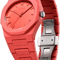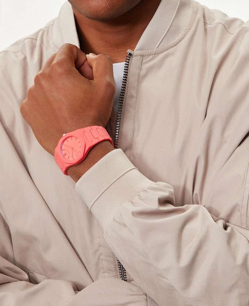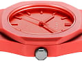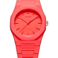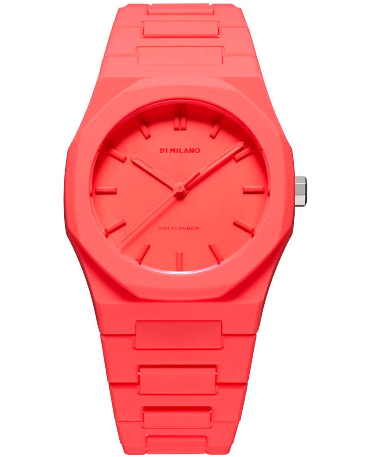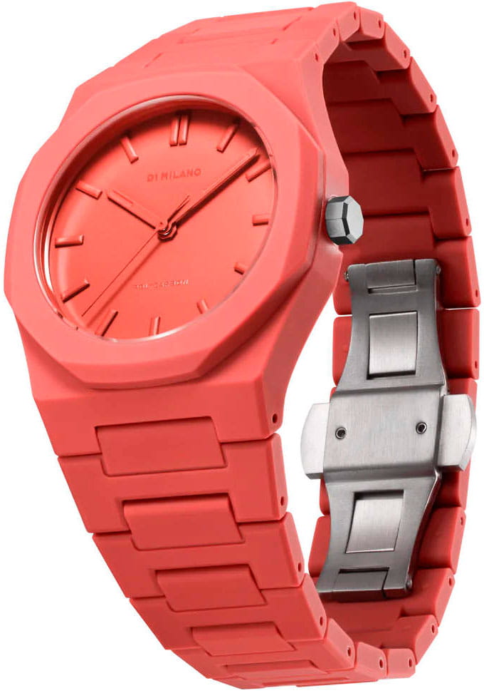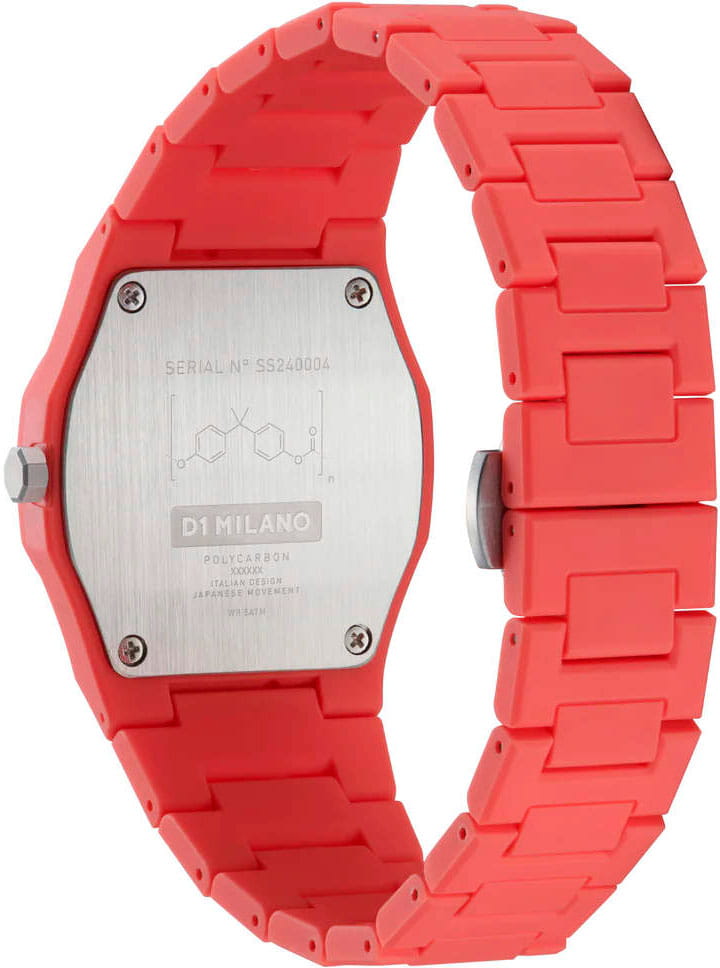 Часы D1 Milano Polycarbon PCBU05 – молодежные часы в стиле унисекс для повседневных образов, стильные и комфортные.  Модель Coral имеет коралловый корпус и браслет из поликарбоната с покрытием Софт-Тач.. Циферблат лаконичный с индексами в виде штрихов, защищен минеральным стекломМинеральное стеклоМинеральное стекло представляет собой искусственно выращенный минерал кварца. Такое стекло отличается особой устойчивостью к повреждениям и царапинам. Уступает по некоторым качествам сапфировому стеклу. с антибликовым покрытием. Стальная задняя крышка на 4 винтах.  Пластиковый браслет на  застёжке «бабочка» с кнопкамиЗастёжка "бабочка"Такой вид застёжки дополняется предохранителями, помогающими избежать случайного раскрытия браслета. Обладают изящным исполнением. .