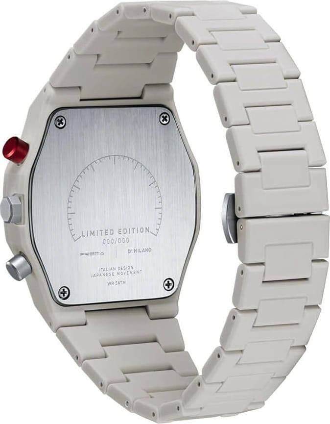 Часы D1 Milano x Prema PHBJPR — это элегантные кварцевые часы, которые впечатляют своим функциональным дизайном. Высокая надежность превращает эти часы в незаменимый аксессуар на каждый день. Модель оснащена хронографомХронографФункция позволяет измерять отрезки времени с особой точностью: часы, минуты, секунды. Верным признаком хронографа является наличие на циферблате 3 дополнительных окошек-счётчиков., секундомеромСекундомерСекундоме́р — прибор, способный измерять интервалы времени с точностью до долей секунды. и циферблатом, защищенным минеральным стекломМинеральное стеклоМинеральное стекло представляет собой искусственно выращенный минерал кварца. Такое стекло отличается особой устойчивостью к повреждениям и царапинам. Уступает по некоторым качествам сапфировому стеклу. с антибликовым покрытиемАнтибликовое покрытиеСлой оксида металла в 0,13-0,3 микрон, благодаря которому стекло часов не бликует и не отражает свет. Антибликовое покрытие уменьшает отражение света в 10 раз, обеспечивая отличную читаемость показателей циферблата.. Изысканный корпус из поликарбоната с покрытием Софт-Тач. На циферблате расположены накладные метки в виде штрихов и три дополнительных циферблата, а также окошко календаря в положении между отметками 4 и 5 часов. Пластиковый браслет с застежкой «бабочка»Застёжка "бабочка"Такой вид застёжки дополняется предохранителями, помогающими избежать случайного раскрытия браслета. Обладают изящным исполнением. . Стальная задняя крышка этих часов крепится на 4-х винтах. Водонепроницаемость до 50 метров делает эти часы идеальным выбором для повседневного использования. Лимитированная серия — 300 экземпляров.